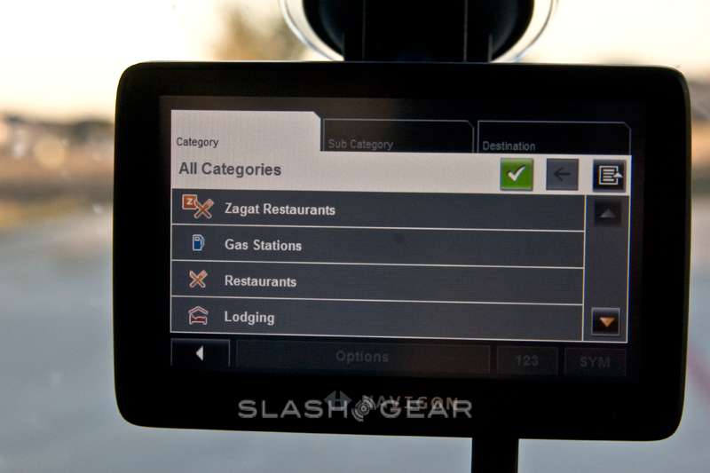 As well as an unspecified huge amount of Points of Interest (POIs), the 7200T has Zagat ratings and reviews for restaurants, brand icons overlaid onto the maps, and one-click access to DirectHelp which, like on rival systems, shows the nearest hospitals and rescue services together with their contact details. Since browsing through all those POIs while driving is a sure-fire way to require one of those rescue services, the 7200T has six shortcuts – food, gas, lodging, rest areas, auto service and shopping – which, when selected, automatically directs you to the nearest exit.