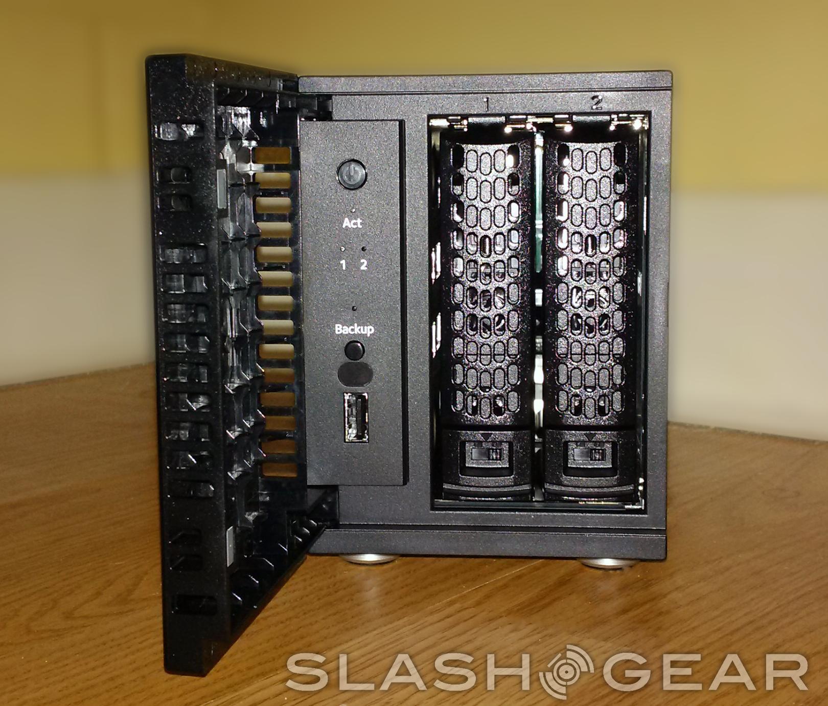 Overall and particularly on the rear of the device, there's one USB 2.0 port and two USB 3.0 ports, as well as an eSATA expansion slot and a Gigabit LAN port. These are positioned below a 92mm fan, while the rest of the controls are positioned on the front of the drive beneath the power button (blue LED). During operation, the NAS pulls 31 watts, which drops to a single watt with wake on LAN.