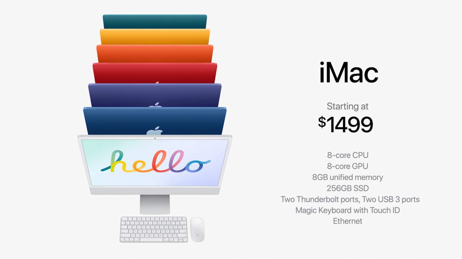There are two configurations for the new iMac: one with a seven-core GPU, an 8-core CPU, 8GB of unified memory, a 256GB SSD, a pair of Thunderbolt ports, a Magic Keyboard, and a Magic Mouse for a starting price $1,299. That configuration will be available in green, pink, blue, and silver. More expensive is a configuration that comes with an 8-core GPU, two additional USB 3 ports, a Magic Keyboard with Touch ID, and Ethernet through the external power supply with a starting price of $1,499.