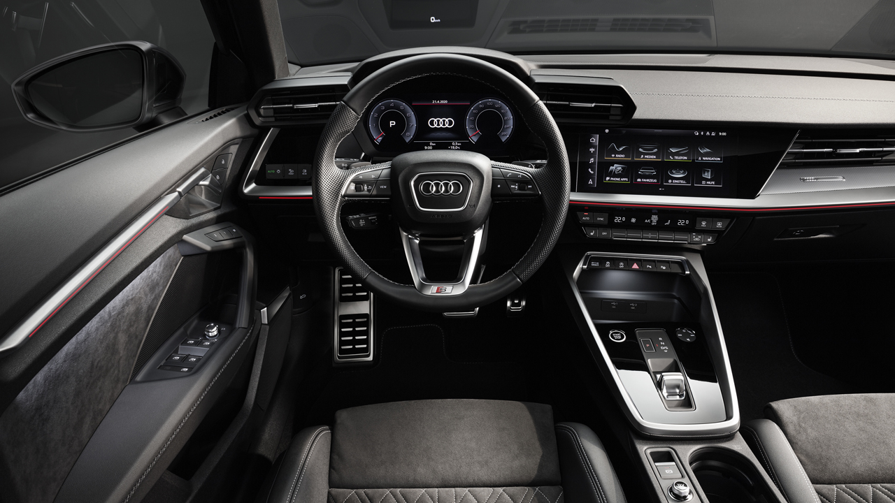 The digital instrument cluster is 10.25-inch and is included in the basic model. Audi virtual cockpit plus versions have a 12.3-inch screen that offers three different views. The car is also fitted with a head-up display projecting important information onto the windshield directly into the driver's field of view. The Audi A3 Sedan will offer a choice of two TFSI engines and one TDI engine at launch. The 35 TFSI is a 1.5-liter direct injection engine making 150 PS paired with a new six-speed manual transmission or a seven-speed S tronic automatic.