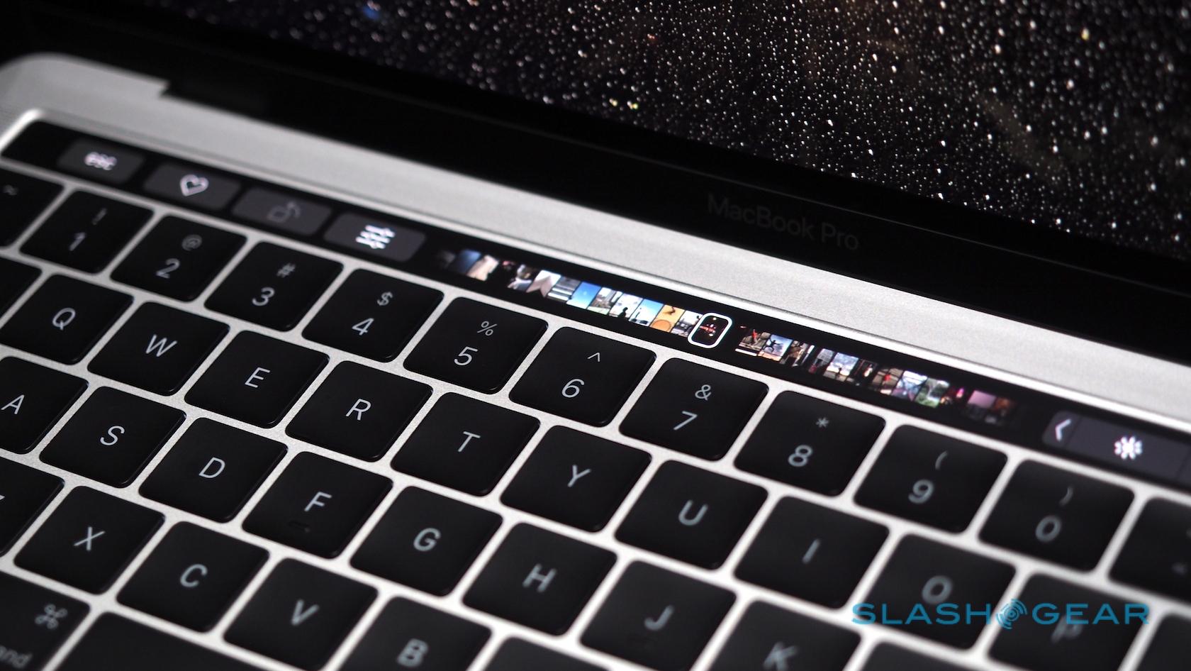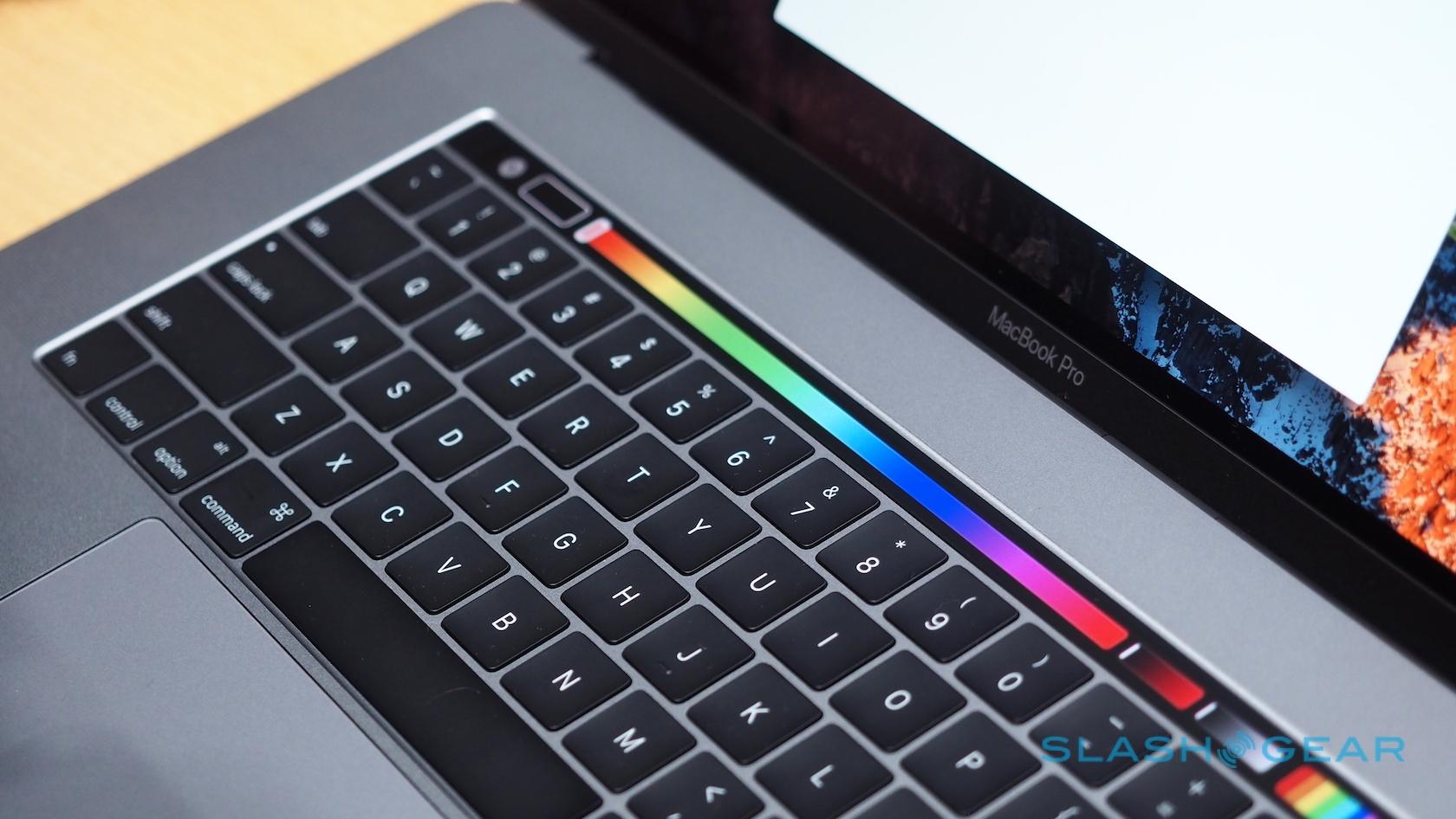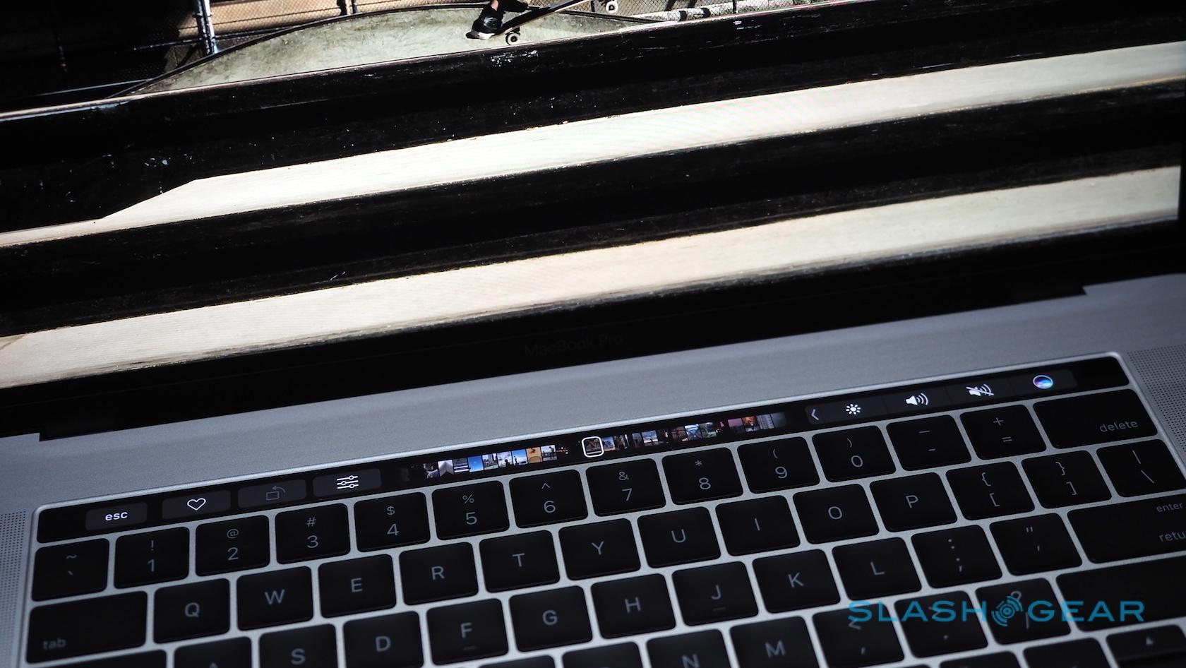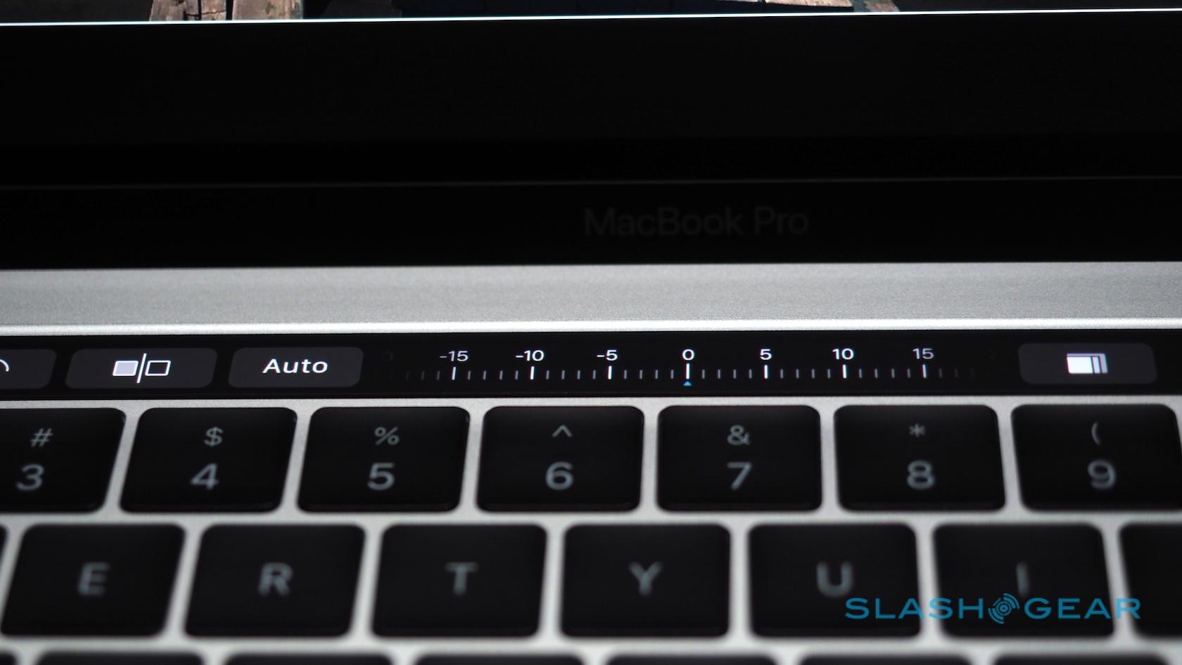Most striking, of course, is the Touch Bar, a touch-sensitive strip that runs atop the keyboard and replaces the function key row. That shows contextually-relevant controls for each app and feature. At the end, there's a Touch ID button covered in sapphire glass.