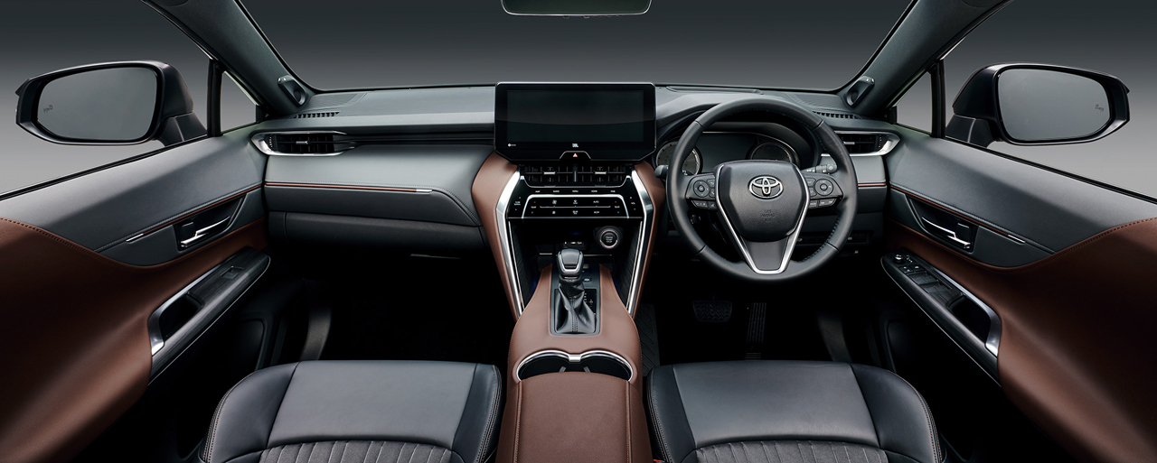 The Harrier is offered in seven colors, including Precious Black Pearl. Inside the vehicle has a center console with a "wide and imposing impression of a horse's saddle." The instrument panel within the edges of the saddle presents a "generous breadth." The dash extends from the instrument panel to the door trims on either side.