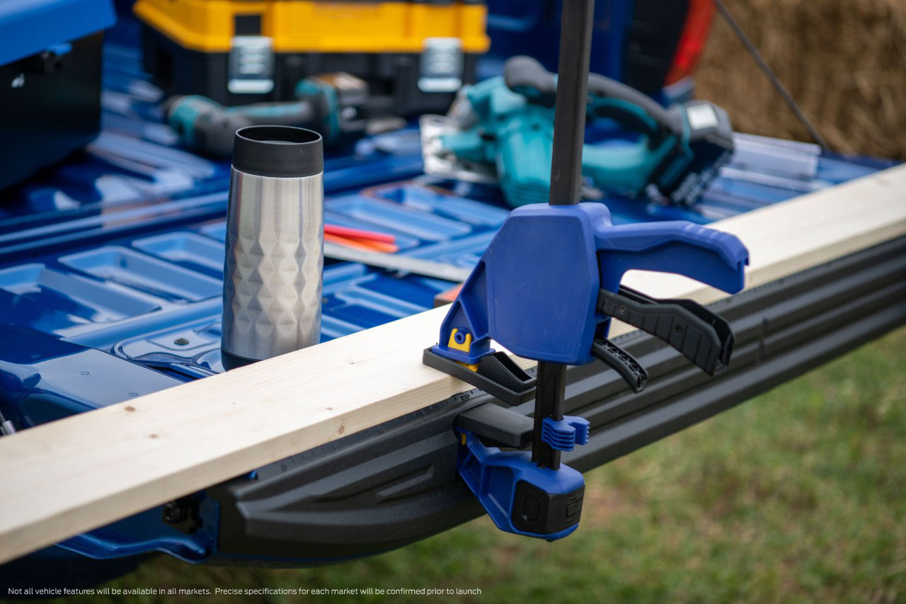 Ranger features a new plastic molded bedliner and additional cargo tiedown points for securing loads. The truck's bed also has flexible load box caps around the sides and across the tailgate that hide structural attachment points for accessories such as camper shells and more. The tailgate was designed to be usable as a mobile workbench featuring integrated ruler and clamp points.