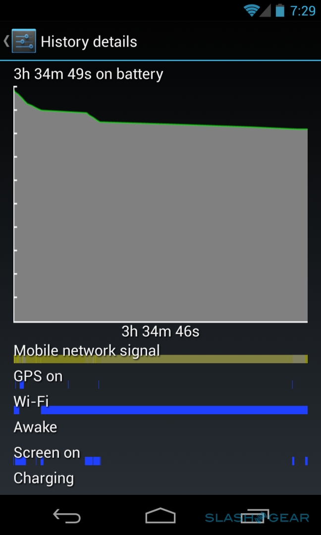 Voice calls with the Nexus 4 were in line with what we experienced from the Optimus G, clear and with no issues with drops or static; the dual microphones help there. Google quotes up to 10hrs of talktime from the 2,100 mAh battery, or up to 7hrs web browsing, though in our experience it was heavily dependent on how bright we had the screen set. LG's HD IPS+ technology is certainly capable of some impressive brightness levels, but it also chews through battery life at the same time. Set to a more moderate level, we got through a full day before needing a recharge.