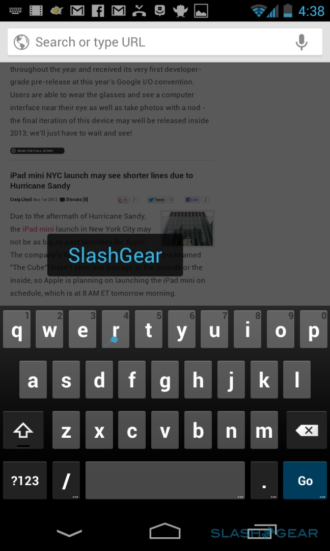 Android's flexibility with third-party keyboards has seen a number of alternative input options arise, though Google may well be putting some of them out of business with its new Gesture Type 'board. Like Swype, it allows text entry by sliding a finger between letters, rather than the usual hunt and tap, with a new word prediction system floating a box above your fingertip for easier review. It makes a real difference with one-handed typing, Google's new system keeping up with faster swiping and proving capable of picking out the most likely word we were typing, as well as gradually learning from our most frequently used words.