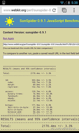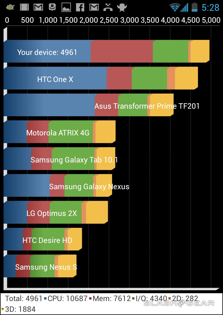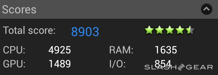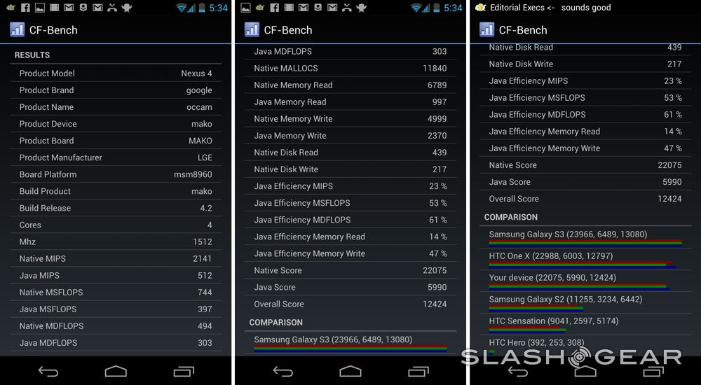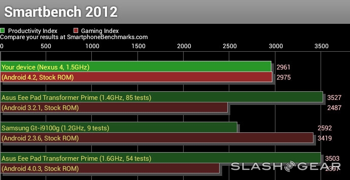 In Smartbench 2012, the Nexus 4 scored 2961 in the productivity category and 2954 in gaming, while in Quadrant it edged ahead of the original HTC One X with a score of 4961. SunSpider, the test of browser JavaScript performance, the new Nexus scored 2170.4ms (lower is better).
