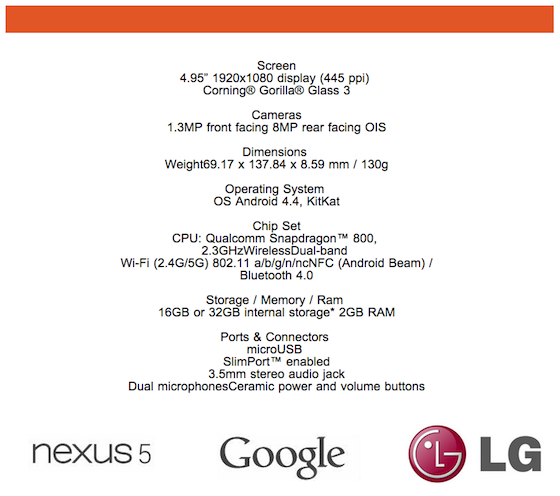 With the Nexus 5, we've seen enough leaks and tips to understand that the machine will be released with a 4.95-inch 1920 x 1080 pixel display, that coming out to be a cool 445 PPI. This machine works with a Gorilla Glass 3 front panel atop a 1.3-megapixel front-facing camera, with an 8-megapixel camera on its back with optical image stabilization (OIS).