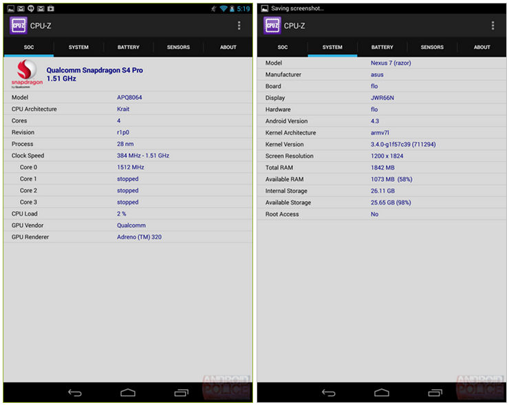 The Nexus 7 is codenamed Razor, and according to the benchmarks features a 7-inch 1920 x 1200 display, as various leaks have suggested. With the bar on the screen, the actual resolution works out to 1200 x 1824 pixels. Under the hood, there's a Qualcomm Snapdragon S4 Pro quad-core 1.5GHz processor and 2GB of RAM. Andreno 320 is pegged for the GPU.