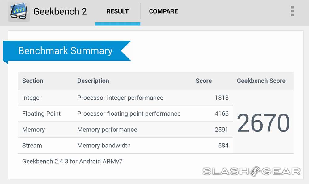 Then comes the Geekbench. This is Geekbench 2, a test that's also available on desktop machines and Android devices. Have an iPad mini handy? Have a peek at how it performs and see how well this much higher-definition device does against it. Fight!