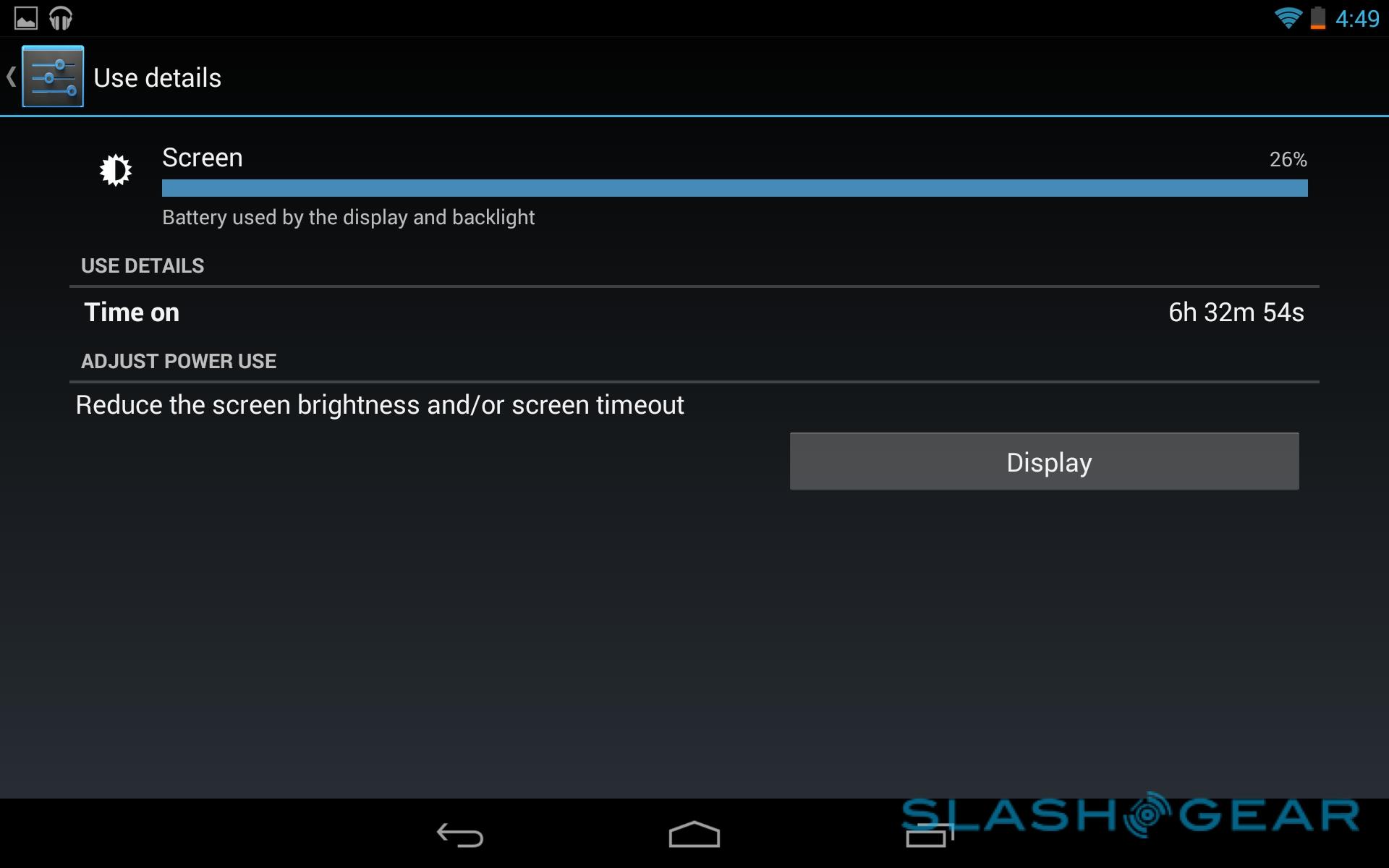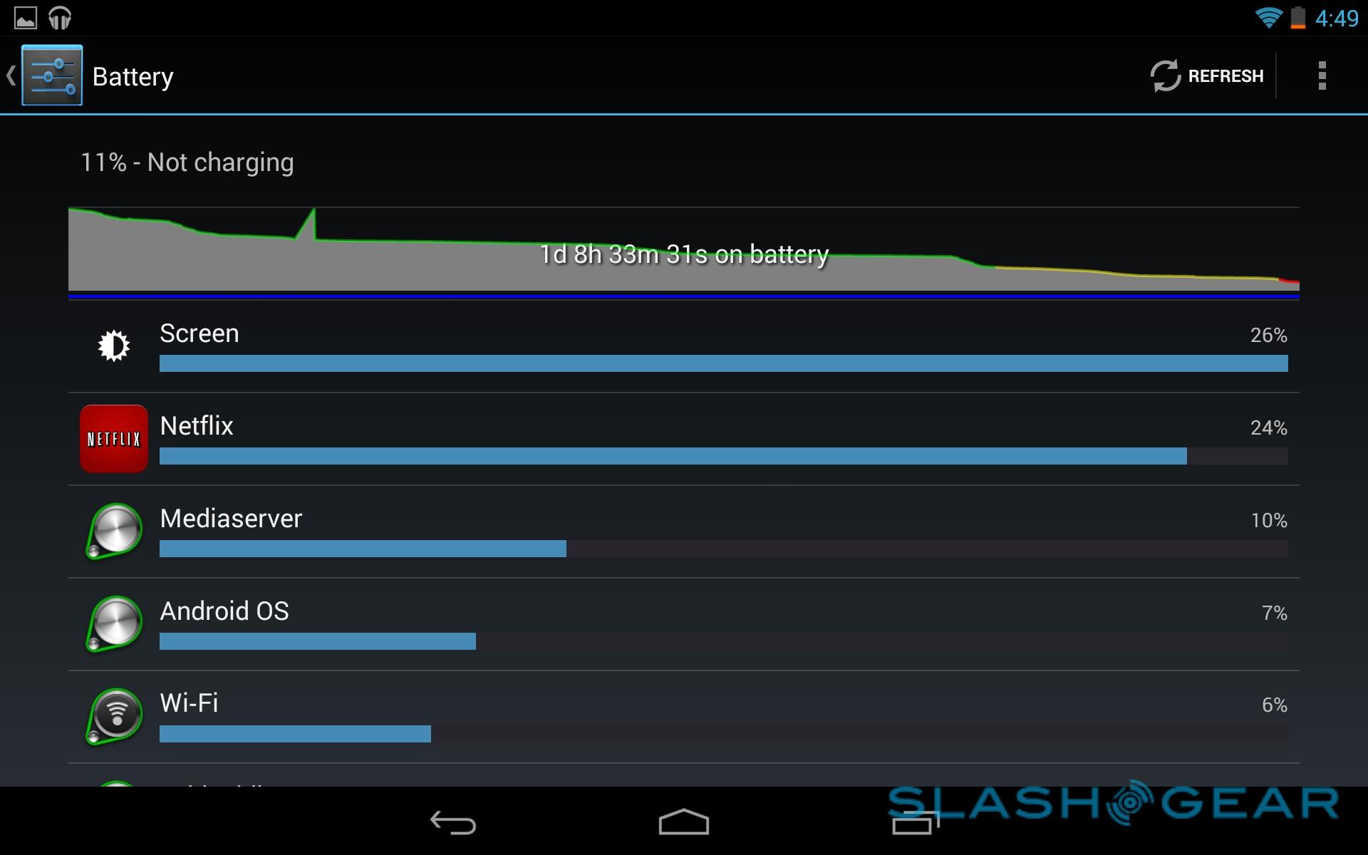 Google quotes up to nine hours of HD video playback or up to ten hours of web-browsing from a full charge. Our own testing suggests these are pretty accurate estimates; with heavy use, including Netflix media streaming over WiFi, push email and social networking turned on, some photography, and browsing, we managed almost nine hours of use before the 2013 Nexus 7 ran out.