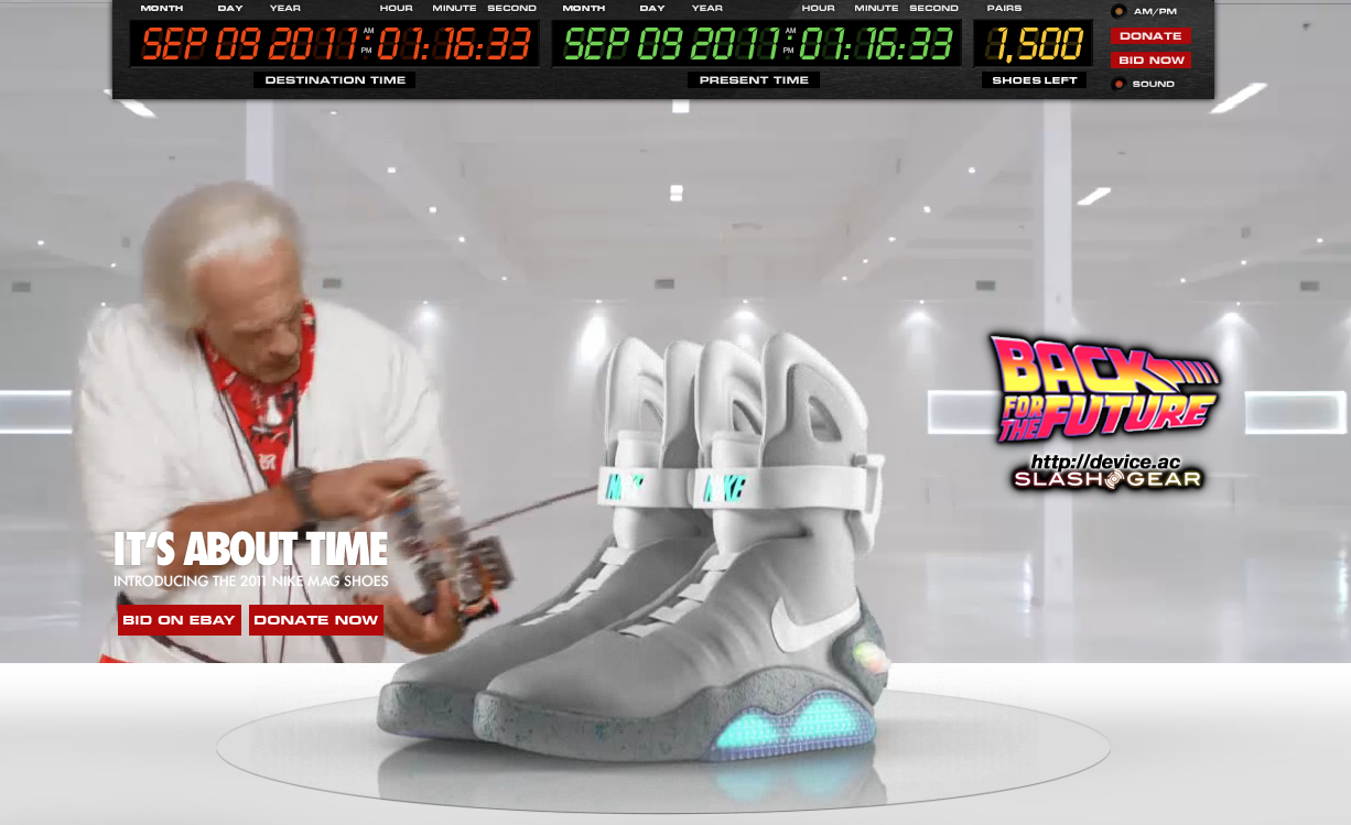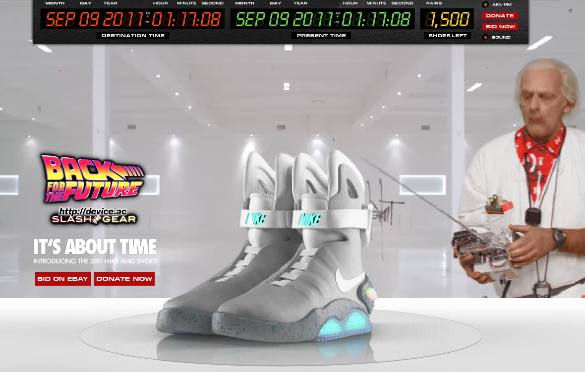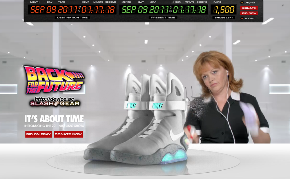 Then head to the NikeMag Back For The Future site to pick yourself up a pair and support the MJF Foundation for Parkinson's Research! Also note that you can check out an extremely well designed Flash-based website for this project over at http://www.back4thefuture.com/ AND that you'll be able to purchase a NIKE MAG ceramic replica of the shoe for $88 USD or a NIKE MAG pin for $10 USD, all of the net sales, again, going to the MJF Foundation.