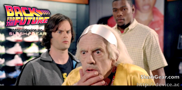 The video here shows Durant at the NIKE shoe shop being helped by Hader who introduces the 2011 MAG, showing off the lights and the lightness of the sneakers (as opposed to "Heavy" as Durant says, this harkening back to Marty McFly's famous catchphrase). The Doc blasts into the room, eyeballs ablaze with classic Christopher Lloyd character acting intensity, demanding to see the MAG sneakers — but wait, where are the power laces? Behind the sales counter, Fullilove and Hatfield stand – Hatfield letting the Doc know that he's traveled back to the wrong future date – he'd have to go forward a bit to 2015 to get the Power Laces version of the NIKE MAG.