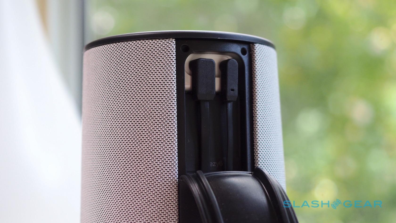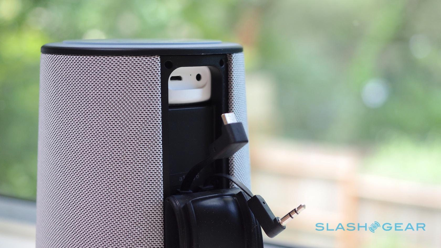 Setup is straightforward, too. Pull open a rubber flap on the back of Vaux, and there are two short cables: microUSB for power, and a 3.5mm plug for audio. Drop your Echo Dot into the circular bay at the top, line up the sockets at the back, and hook up the two cords; the rubber flap closes back up to keep things looking tidy.