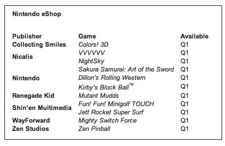 On the 3DS, Resident Evil Revelations will be landing on February 7. There is also a new Metal Gear Solid 3D Snake Eater coming in Q1 for the 3DS. In the Nintendo eShop for the 3DS will be a number of new download games including Dillon's Rolling Western tower defense strategy game are coming. There are a number of other games coming to the eShop too like NightSky.