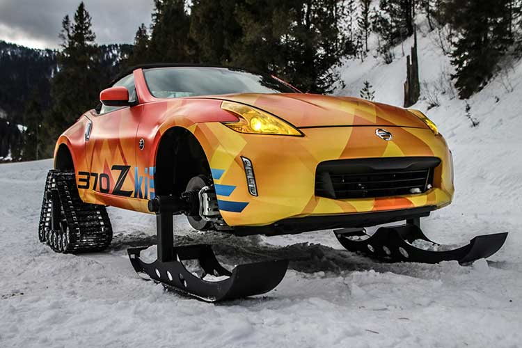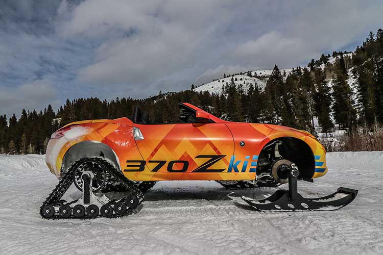 The front bumper, fender flares, and roof rack were built by Smittybilt. Most of the other stuff is from Pro Comp with a custom Katzkin interior. The 370Zki is a much wilder beast. This car started as a normal 370Z Roadster packing 332-hp and was modified to tackle the slopes and trails like a big snowmobile.