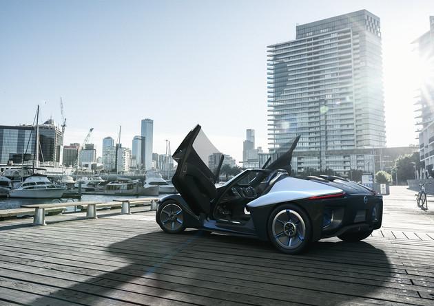 The car has very interesting styling with the front two wheels set much closer together than the rear wheels and unique wing style doors that open up and forward. The car also has unique seating arrangement putting the driver in the center of the vehicle in the front all alone.