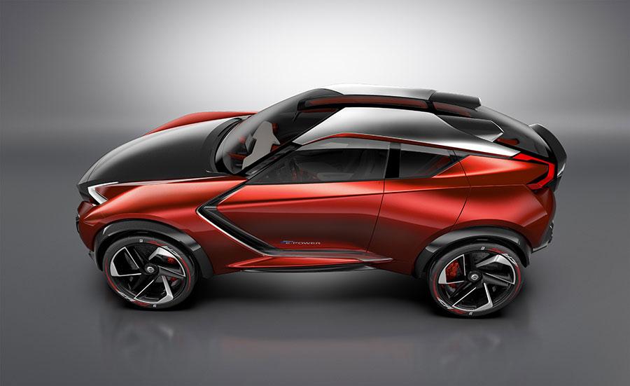 Nissan says that the Gripz car blends the practicality of a crossover with the performance of a sports car. Gripz has EV tech inside with a Series hybrid system dubbed "Pure Drive" e-power. On the outside, the vehicle is designed to have the smaller footprint or a compact crossover with the silhouette of a sports car with a raised ride height.