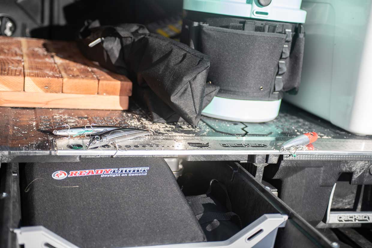 There are plenty of places to store surfboards and fishing rods. An awning that wraps around the rear of the truck keeps the sun off while beachgoers shower with the solar heated portable shower. A big cooler in the bed of the truck keeps food and drinks cold and at hand.