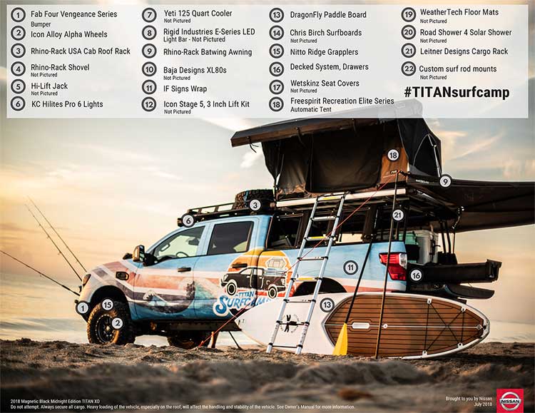 Under all that cool gear is an XD Midnight Edition truck with a Cummins 5.0L diesel V8 engine. The Icon lift kit is available directly through Nissan dealers. The wrap on the truck was inspired by a Hot Wheels car, specifically, the 1971 Datsun Bluebird Wagon called "JNC Surf Patrol".
