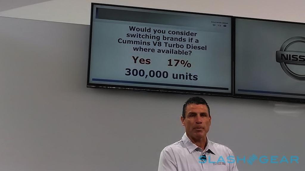 In fact, Nissan explained at the opening day of its Nissan 360 conference, 17-percent of people surveyed said "yes" when asked if they would "consider switching brands if a Cummins V8 Turbo Diesel were available."
