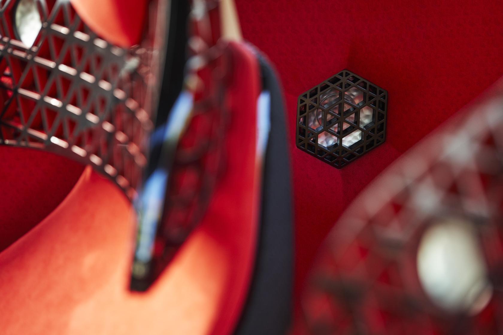 The boomerang headlamps are intended to resemble forged steel blades. High beam, low beam, turn signals, and positioning lamps are all integrated into a single unit, the intensity and color of which adjusts according to the function it needs to play. At the rear, it's Japanese woodwork and puzzles – or kumiko – which have inspired the taillamps, which are in fact holograms to give their illusion of physical structure.