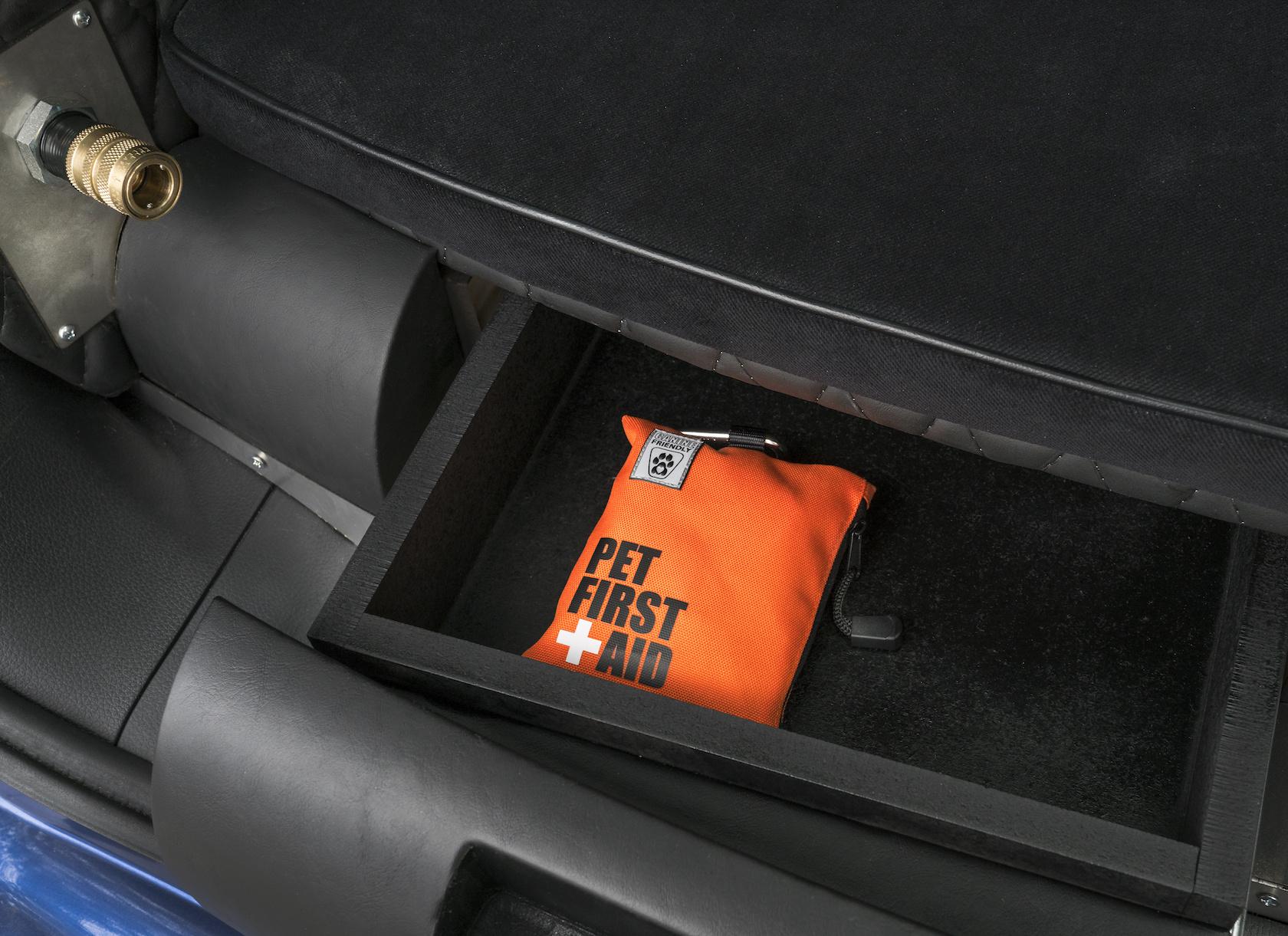 Finally, there's a canine-focused first aid kit stowed in the rear, along with a side-mounted dispenser for waste bags. An extra storage drawer can be used for treats, toys, and a leash.