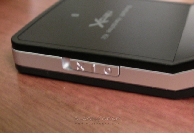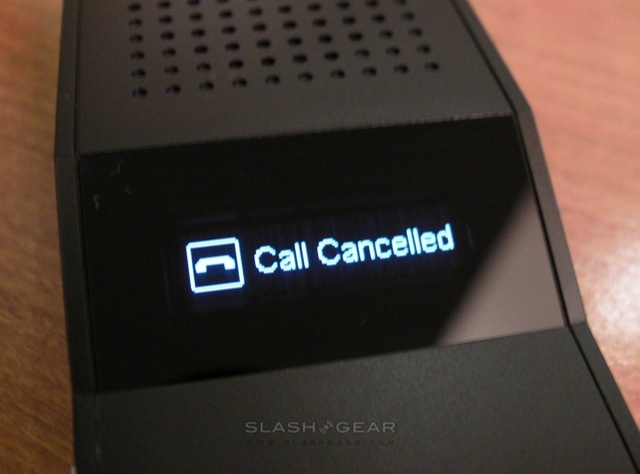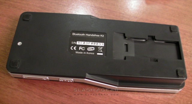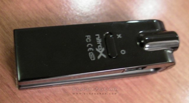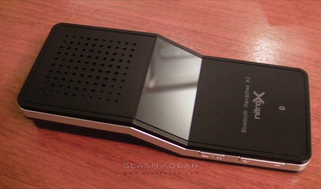 As for the Nitrox X835, that's a larger device intended to be used not only in the car but as an impromptu speakerphone. It too has an OLED display for caller ID and the like, together with a large multi-function button, side-mounted volume controls and a hold switch for use when transporting it between car and office. Nitrox supply a detachable metal clip to attach the X835 to your sun visor, and there's not only an accelerometer that flips the display depending on which way around the device is being used, but vibration sensors that can automatically power it up and begin the re-pairing process when it feels the car's engine has started.