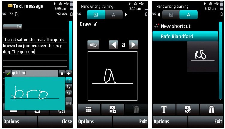 One question that is on everyone's mind is how does the 5800 handle text entry. There are 4 different methods for text entry, on screen virtual alphanumeric keypad with T9 or multi-tap, mini-QWERTY keyboard, full screen QWERTY and handwriting recognition. As expected both the alphanumeric keypad and the full QWERTY keyboard take up the whole screen. The mini-QWERTY keyboard reportedly "doesn't work well with finger touch" as the keys are just too small. The full QWERTY as usual requires two hands to use, it's far too large for one hand operation. It is really nice to see a phone with a choice when it comes to data entry.