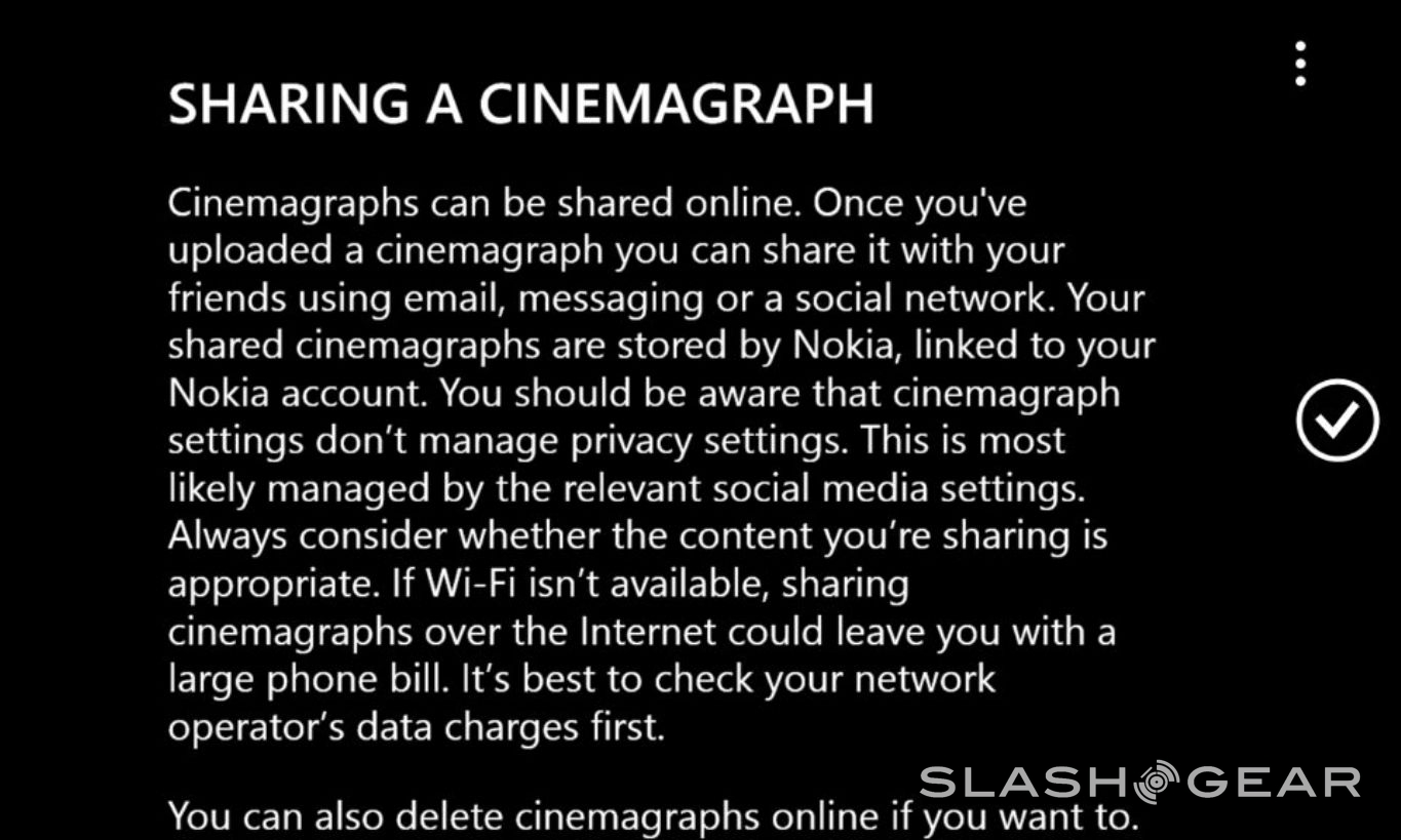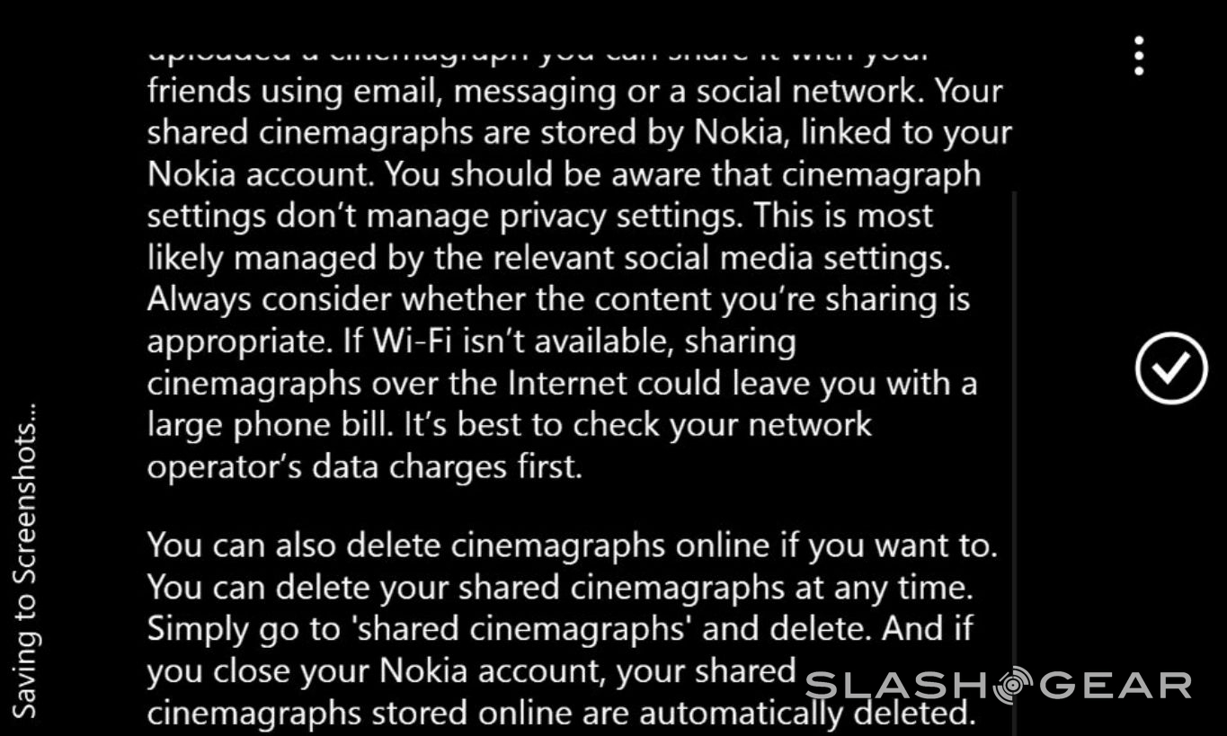Therefor if you share with Facebook, you don't get the image planted in your Facebook gallery, you get a link to a memories.nokia.com website with your image there animated on its own. Have a peek at a Cinemagraph of a cup of Mountain Dew shared to the Cinemagraph webpage right here, and take note of how public it is: [Cinemagraph Share]. Below you'll also see a tiny gallery outlining the terms you agree to when you first sign up to get this update to the app – beware, but also just chill out and use it.