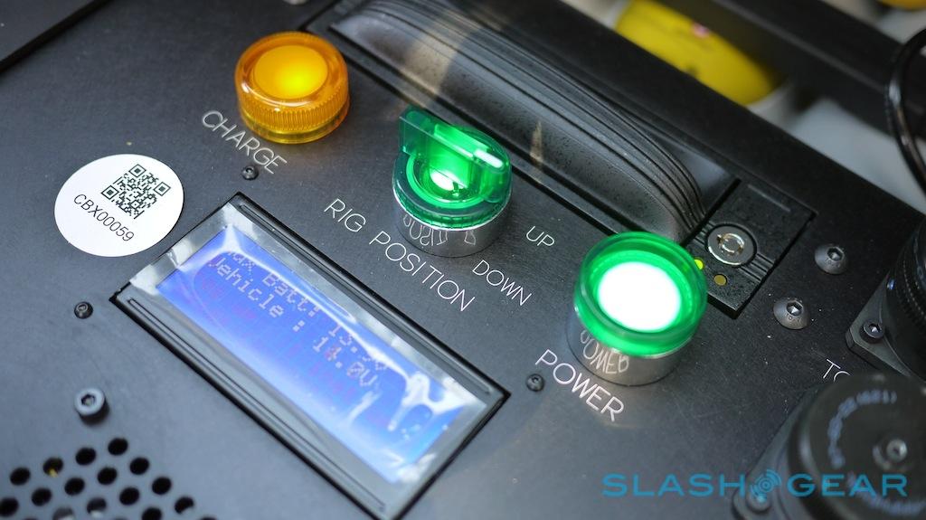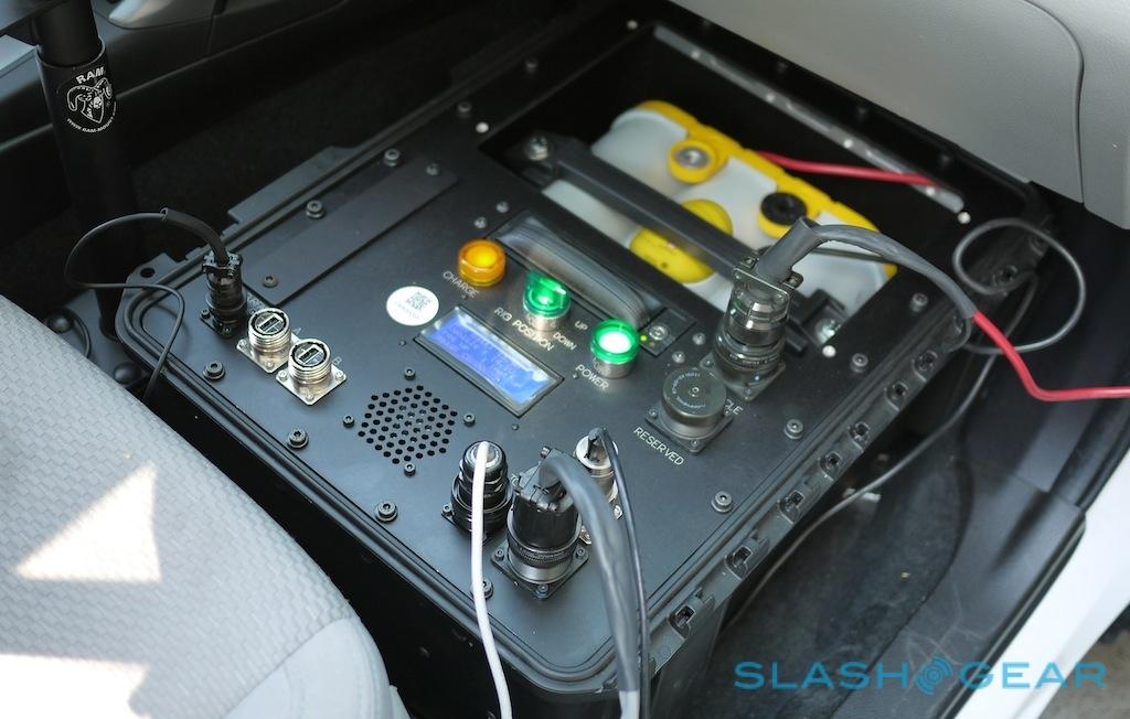 Both systems – and a high-accuracy GPS sensor, housed in an off-white box on the lower part of the extending camera rig – feed data into a large logging box sat in the front passenger footwell. That has controls to power-up the array, as well as to raise or lower the rig (which, when extended, reminds us a little of Johnny 5 from Short Circuit), and records all the data to a hard-drive in a removable caddy. A single drive can store around three days of data – at around 140GB a day – and when full the drivers can simply pull them out and mail them back to Earthmine's processing facility for crunching.