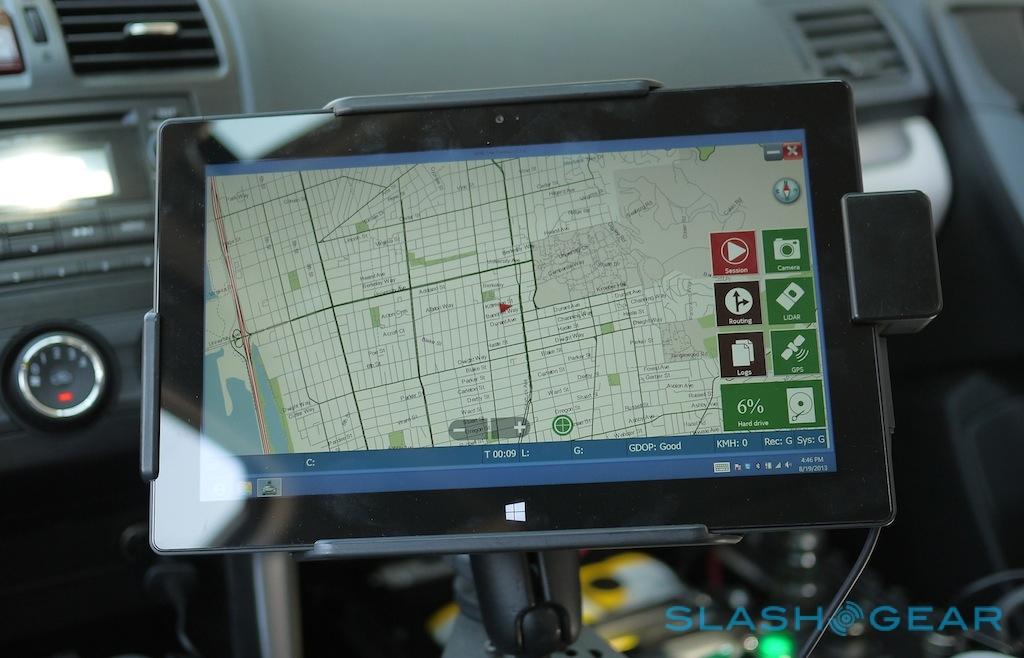 Everything is controlled, meanwhile, by a custom app written by Nokia and the former Earthmine team running on a Microsoft Surface tablet mounted to the dashboard. That, dubbed HERE True Control, not only manages the 3D camera system but guides the driver around their route, and gives real-time feedback to Nokia's servers as to how much of the recording is complete, where the car is, and other data thanks to a tethered Lumia 920.
