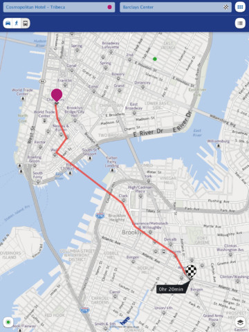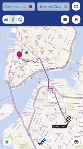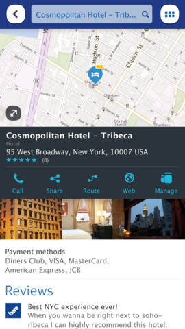 So, you get offline caching of a single map area, points of interest with integrated Time Out and Lonely Planet reviews, and links to browser-based reviews from Qype and other services. There's also navigation, with options for car, pedestrian, and public transport routes.