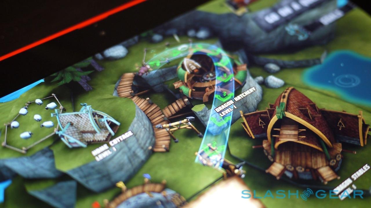 Dragons Adventure sets out to recreate the surrounding world as a How to Train your Dragon movie, using GPS to pull in maps of the local area which are then redesigned, on the tablet's display, for gameplay. Roads become dirt tracks; traffic conditions are mimicked with blockades and other perils; and even weather in the real world is echoed on-screen. Inside that environment, children are set challenges like picking and training a dragon, harvesting crops, and other goals.