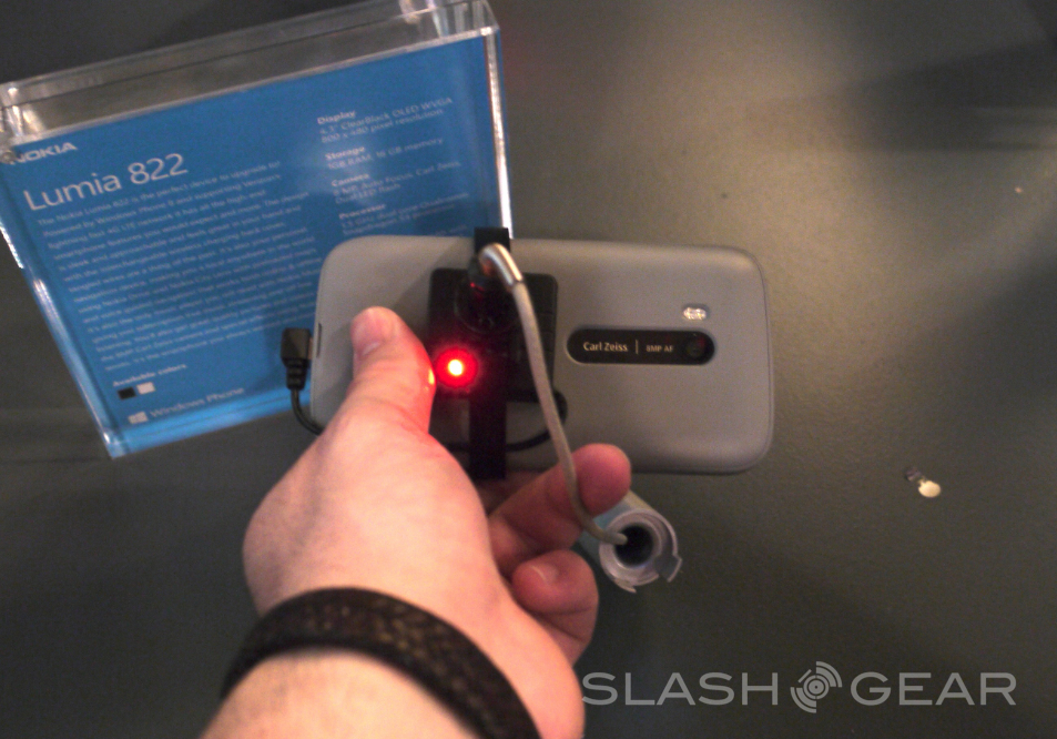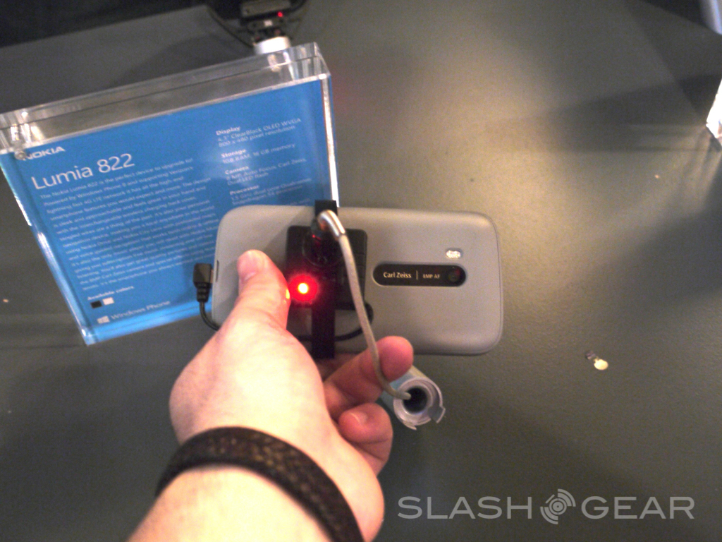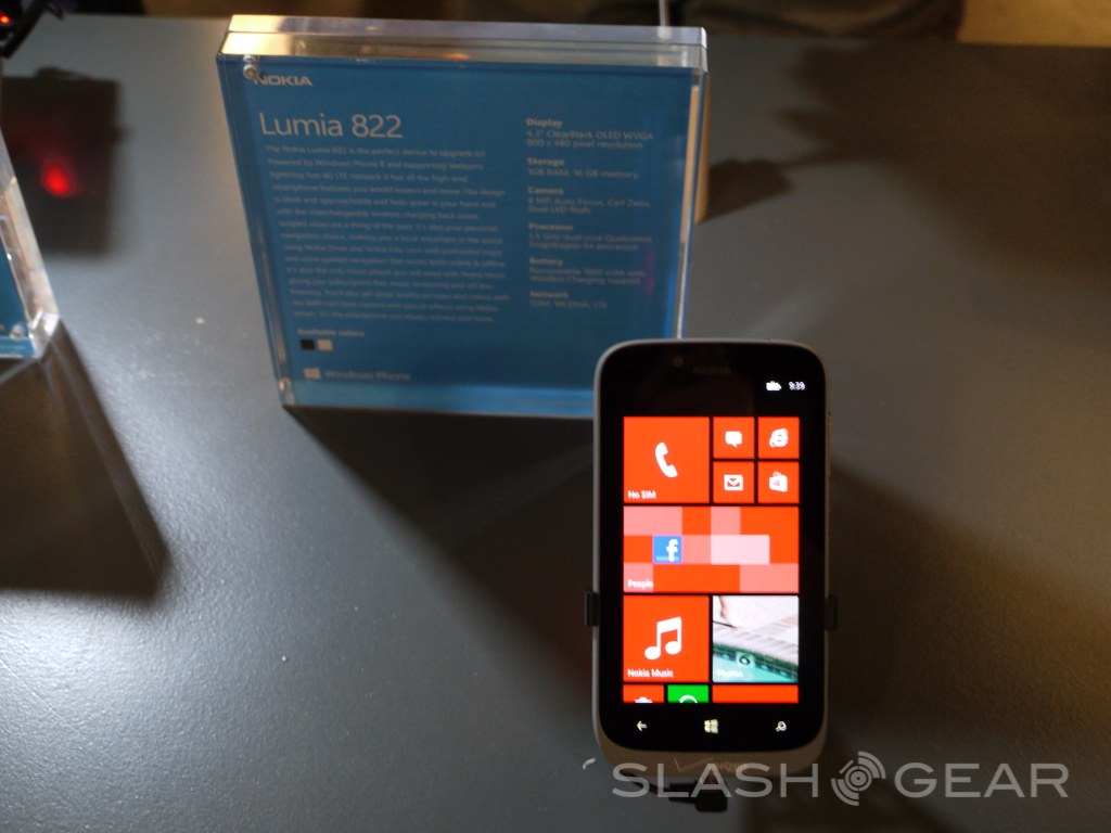 It's Windows Phone 8 day and Verizon's brand new Nokia Lumia 822 is up on display for all to see and touch. This unit works with Windows Phone 8 of course and will have 4G LTE upon launching, right here we're seeing specifications – and a aesthetics – that are rather similar to the Lumia 822 that exists in GSM form for both AT&T and T-Mobile as the Nokia Lumia 820 or slight variations therein. This device will be appearing with a lovely 4.3-inch display at WVGA 480 x 800 resolution and you've got a replaceable back cover that'll allow wireless charging if you pick the right one.