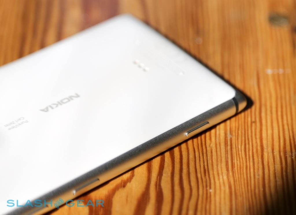 On top, like a meniscus bubble of liquid, is the toughened glass display, unmarked aside from the earpiece notch, Nokia's logo, and the three touch-sensitive buttons under the 4.5-inch screen. The only physical controls run down the right edge, narrow slivers of metal that have good tactile feel, while the top edge has the microSIM tray, a 3.5mm headphone jack, and a microUSB port.