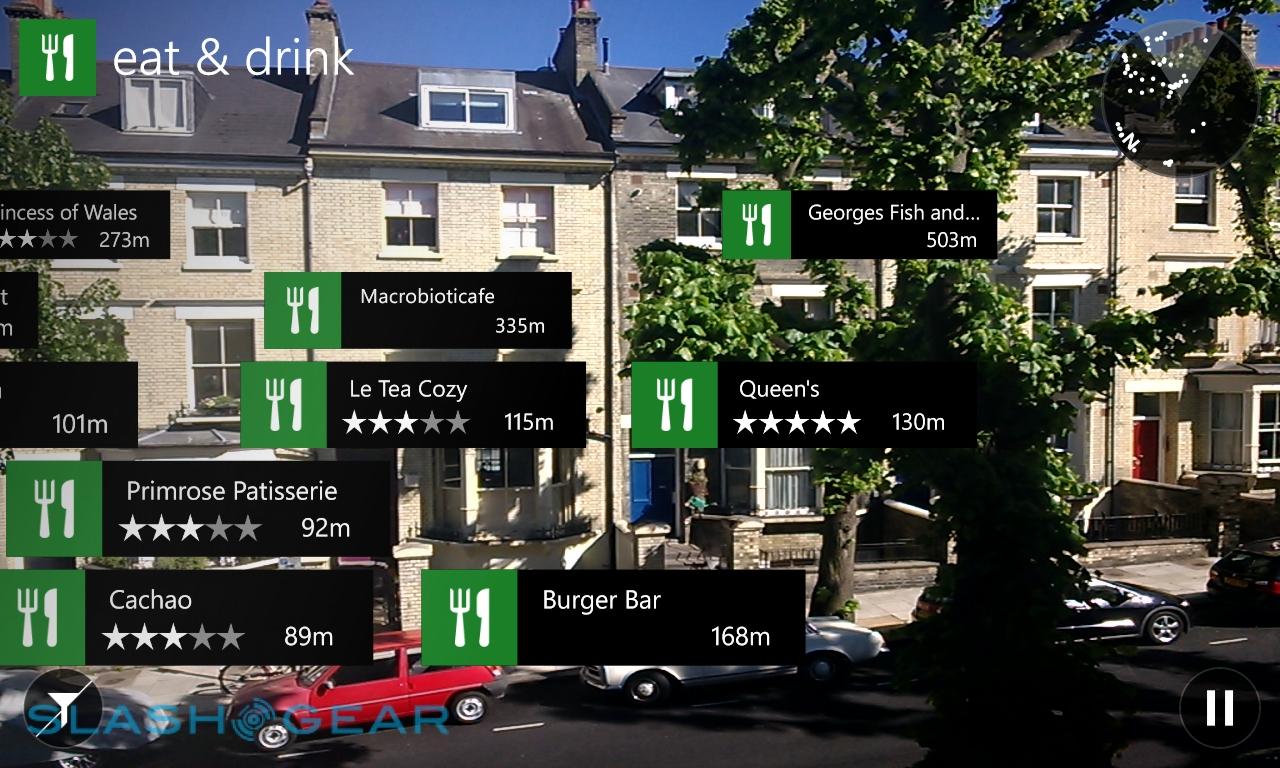 Finally, there's HERE City Lens, which is Nokia's stab at augmented reality. The concept is one of discovery: you can choose from a category, such as "eat & drink", "shopping", or "transport", or show all of the potential attractions, and by holding the Lumia 925 up see their location float over a view of the real world from the camera. Tapping an individual record brings up its address, physical distance away and an option to get directions, and the ability to share it or see more information.