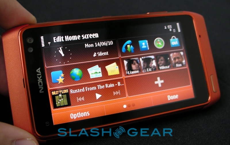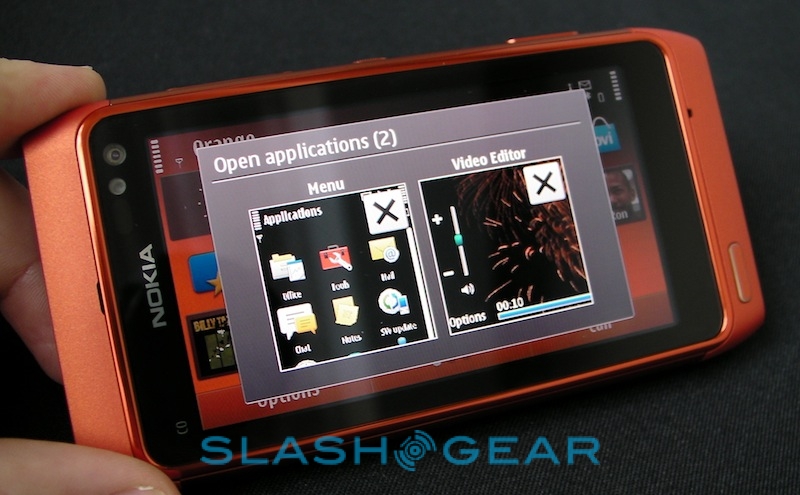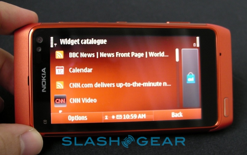 Long-pressing the home button pulls up an app switcher which can be used to flip between running software – the N8 supports true multitasking – and each app has a close button so that you can shut it down direct. The homescreen has three panes, each of which with six slots for widgets; tapping and holding the screen allows you to move widgets around, while tapping an empty slot calls up the widget catalog (which has a link to the Ovi store for downloading new widgets). Nokia have reworked their email app for the N8 – it supports multiple inboxes, though not one combined inbox, HTML messages, and each account can have its own homescreen widget – and you can easily filter by sender and date.