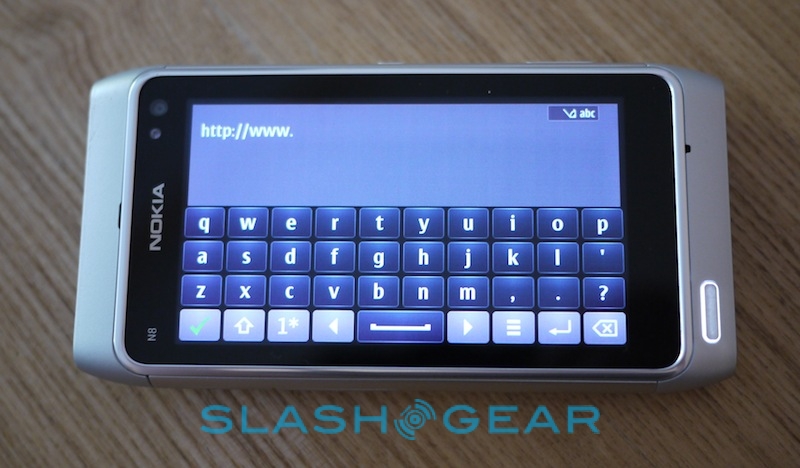 Most frustrating, though, is the on-screen keyboard. The N8 has both portrait and landscape 'boards, but only the latter gets a full QWERTY layout. In portrait mode you're stuck with a numeric keyboard and either multitap or T9 prediction. Having used QVGA (i.e. 320 x 240) touchscreen devices which nonetheless manage to offer full QWERTY in both orientations, it's a painful omission. T9 works best when you have a physical keypad – since you can type without looking – which is obviously missing from the N8.