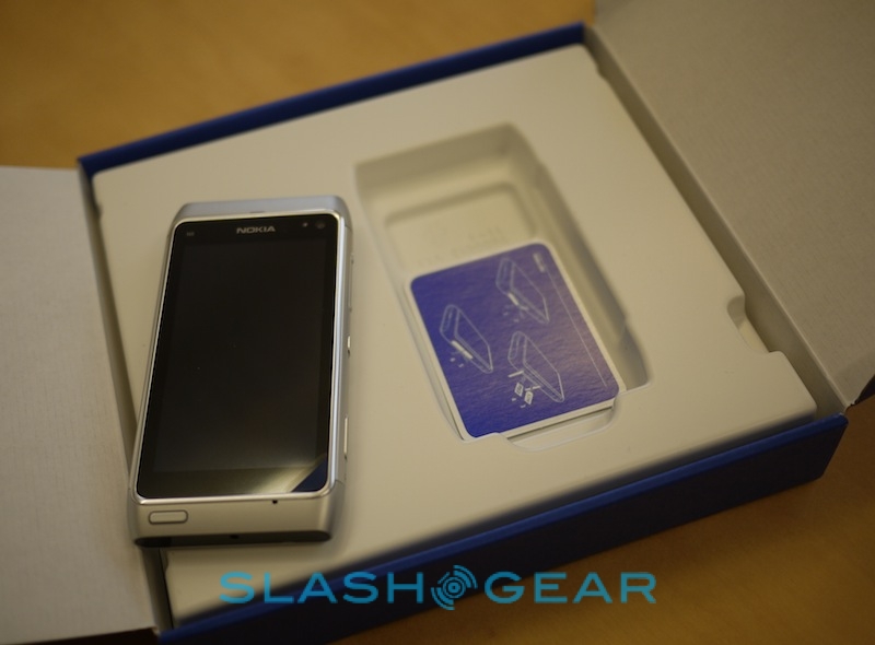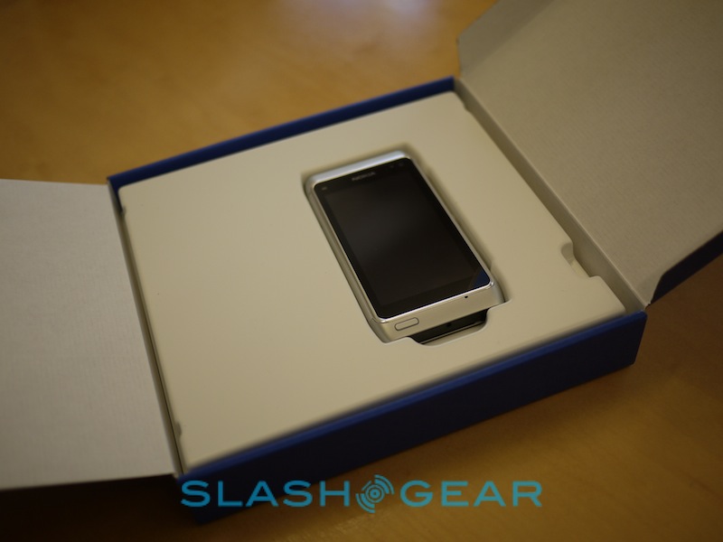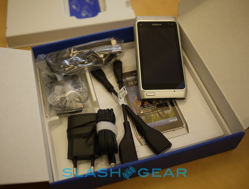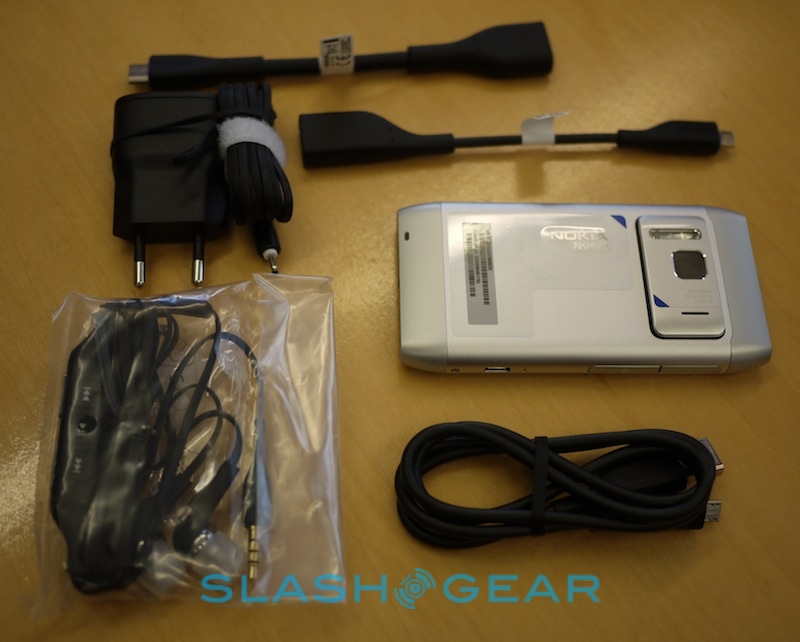 In the box, meanwhile, Nokia bundle the charger, an AC adapter – one of the low-profile European models in this case – and a wired stereo headset with in-line media controls. There's also a USB to microUSB cable, a short miniHDMI to HDMI adapter cable and a short microUSB to USB Host adapter. No case, but Nokia has previously said that mild scratches on the N8's casing should rub straight off.