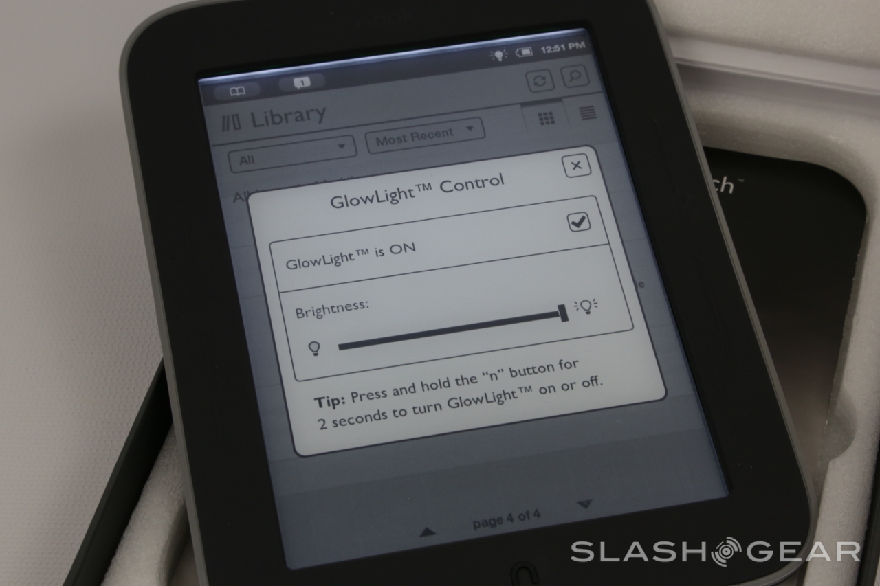 In practice, it's certainly far more comfortable than reading a regular tablet display for an extended period when in a low-light environment. Holding the "n" button below the screen down turns GlowLight on, and then a second tap opens up a settings menu where brightness can be adjusted. Hold down the "n" again and the frontlight shuts off. With a little adjustment to suit the ambient lighting, we were soon comfortably reading.
