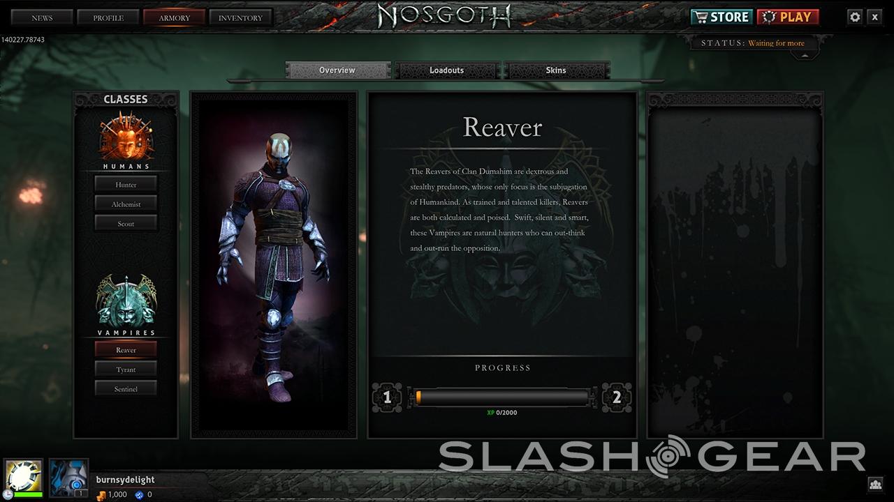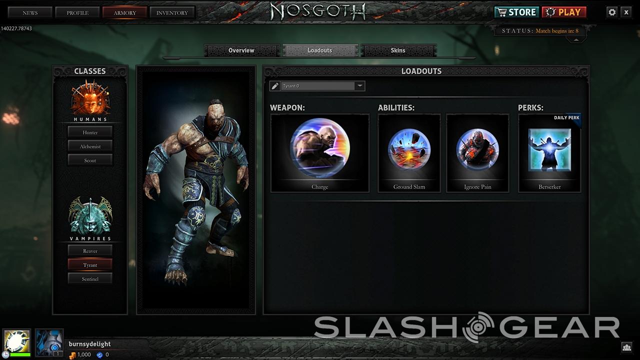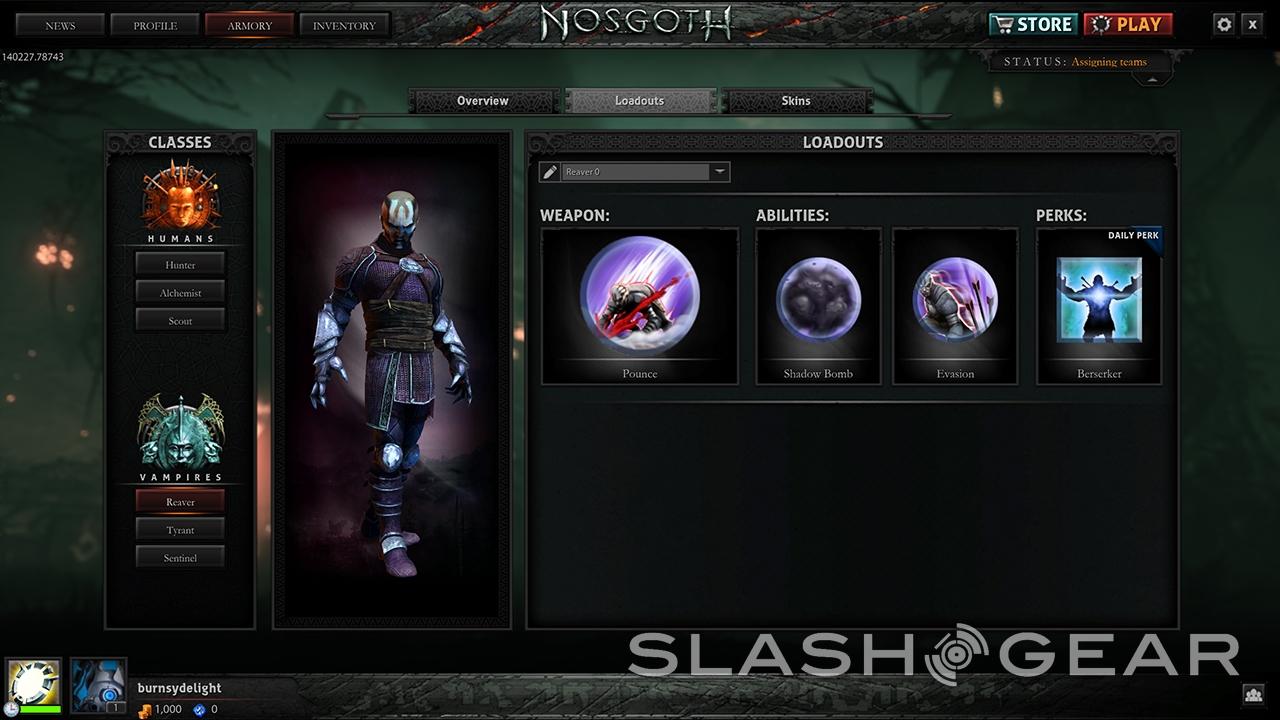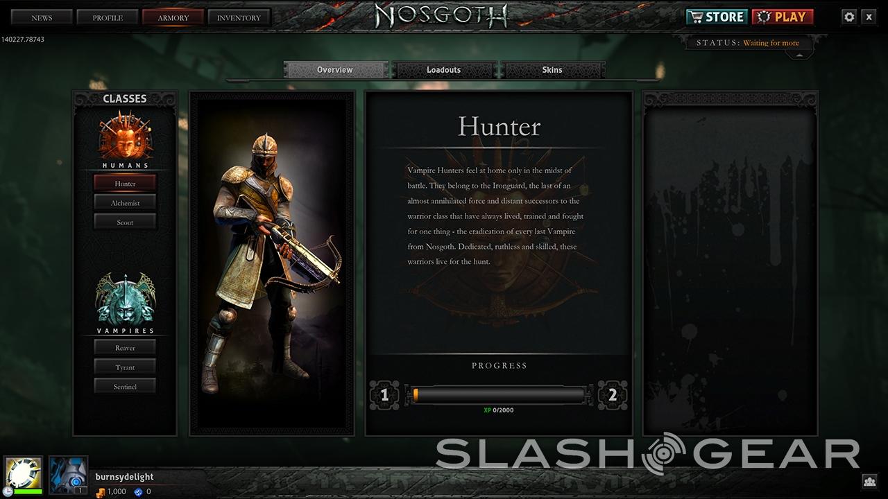 This game is a multiplayer title, so launching into play means launching into a match. Here you'll see us jumping in with three character classes for each side of the war. There are three classes for Humans and three classes for Vampires, each of them with entirely unique sets of skills.