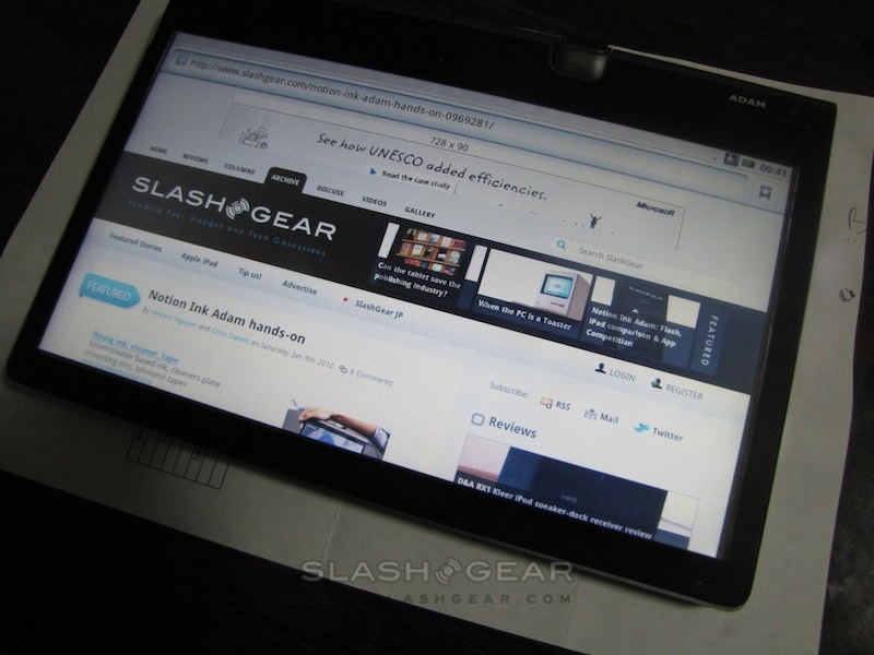 As far as we've heard, Notion Ink and NVIDIA are showing off the Adam prototypes to various potential carrier partners this week, so we're crossing our fingers for some affordable subsidies and data plans. In the video below you can see Adam's rotating webcam – which flips to the front for video calls and to the back for photography – together with Flash video playback; we'll have more for you later in the week!