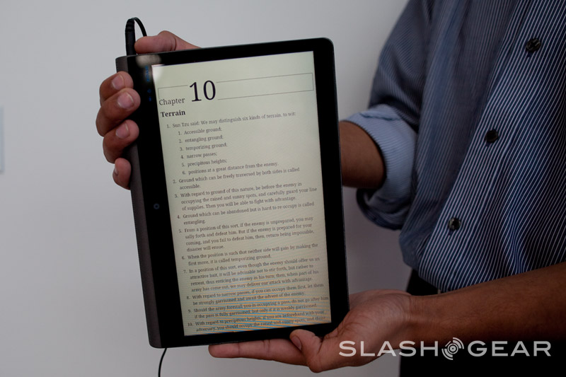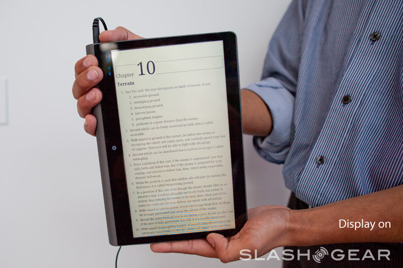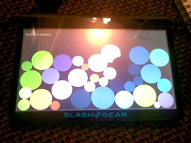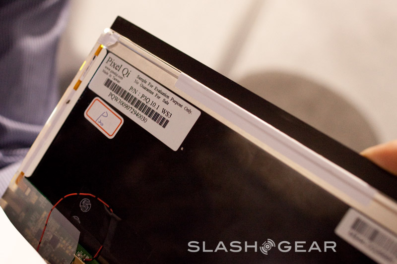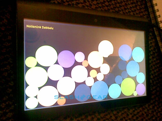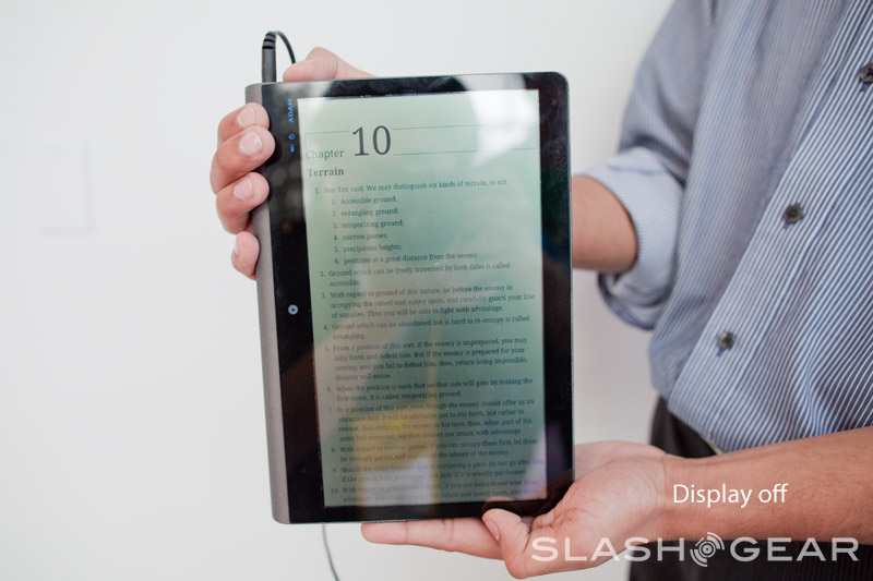 Pixel Qi's technology means you can operate the display in two different modes: as full color LCD for use indoors or in a low-power reflective mode that actually gets brighter the more direct sunlight falls upon it. This latter mode is comparable to E Ink in its appearance, but Pixel Qi can still show smooth, responsive video (and slightly muted colors). Users will be able to manually switch the backlighting on or off, or leave it set to automatic and have the Adam toggle it itself. Notion Ink also offered to take the Adam out into direct sunlight so SlashGear could exclusively see the screen performance there.