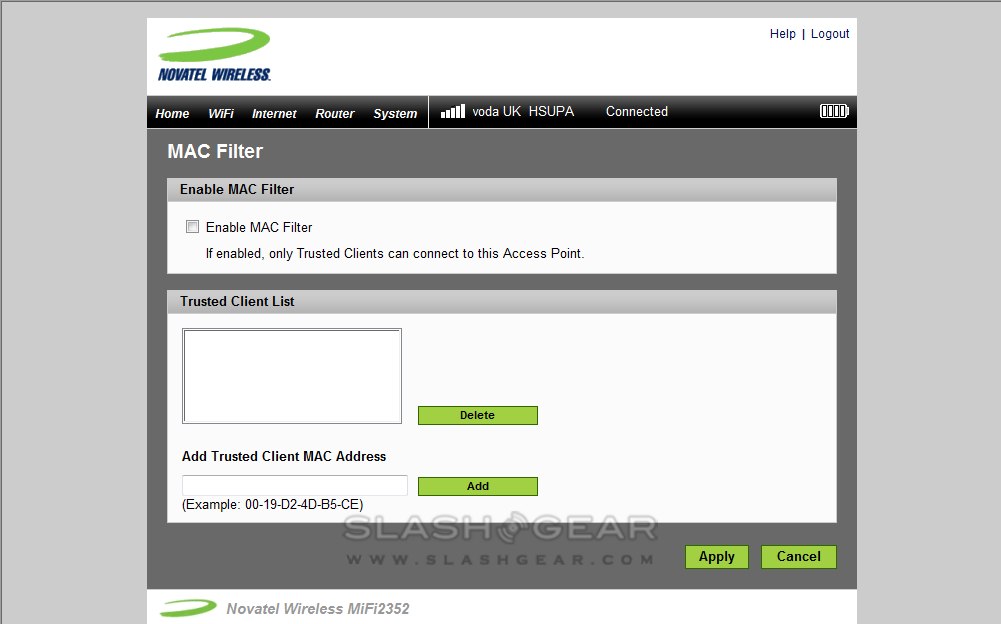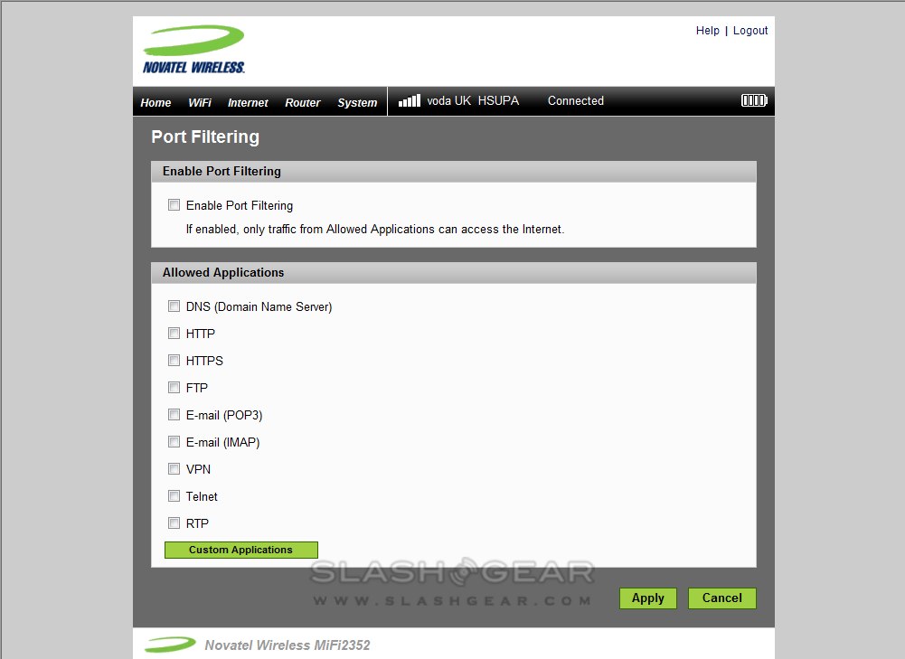 As on a full-sized router, there's also port filtering support, the ability to set custom permitted applications, port forwarding, a switchable DHCP server and VPN pass-through support. Unlike a normal router there's also an optional power management setting which can shut the MiFi down after between 2 or 60 minutes of idle time. Once you've made all the tweaks you want, you can backup the settings to a connected computer.