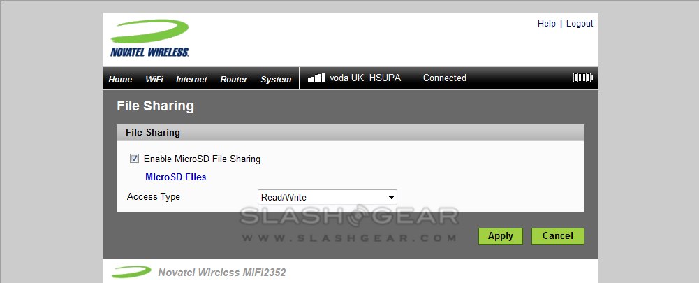 One of the main differences between this HSPA MiFi and the CDMA versions available in the US is its microSD slot, according to the documentation happy with up to 16GB cards. With this, it's possible to turn the MiFi into a miniature, portable NAS of sorts; access can be set as read-only or read/write, though there's no granular password control over different users as you'd find on a full-scale NAS. From talking with Novatel, it seems this might be addressed in a future update. Access, though, is limited to anybody with encrypted WiFi access, which is likely enough control for most users, making the MiFi ideal for storing commonly-accessed files and documentation. It's also ideal for use with a netbook, UMPC or MID, which might sacrifice internal storage for portability. A few 16GB microSD cards are a whole lot cheaper than paying for an SSD upgrade on such a device, plus they're then of benefit to any WiFi-connected computer.