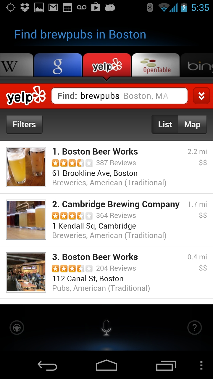 There's also the ability to check the weather from a location simply by asking for it, to look up local businesses and landmarks, and to find places to eat and make reservations there. Dragon Mobile Assistant can also use the same website search tools as in Dragon Go!, querying information across more then 200 sites.
