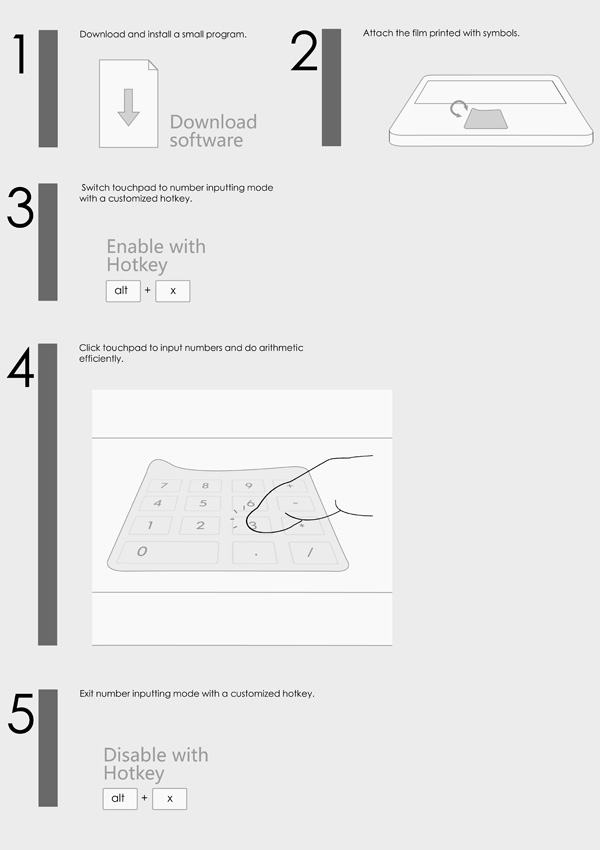 This week a rather simplistic approach for getting that all-powerful number-centric keyboard of calculations, aka the keypad, has been revealed by designers Gong Huachao and Wang Hui. What we've got here is a transparent film that fits over your touchpad that shows numbers and a few buttons for calculations, this working with an application that allows your computer to recognize the different taps you make on the touchpad as the numbers and symbols you've tapped. A better strange use for the above-average sensitivity of the touchpad on your MacBook has never been seen.
