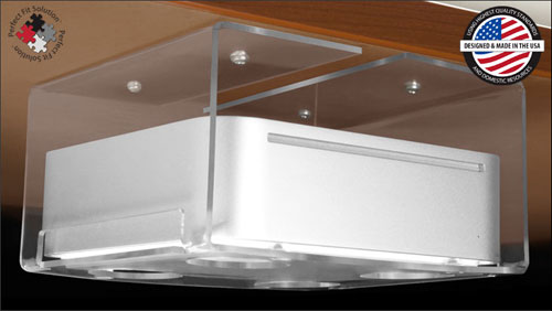 One of the versions is the NuShelf for Mac mini and it fits the pre 2010 update mini computers and sells for $27.99. The NuShelf Mount for 2010 Mac mini is designed to work with the newest mini in the line. A Dual Mount for 2010 Mac mini is also available and is designed to hold a pair of the small desktop computers.