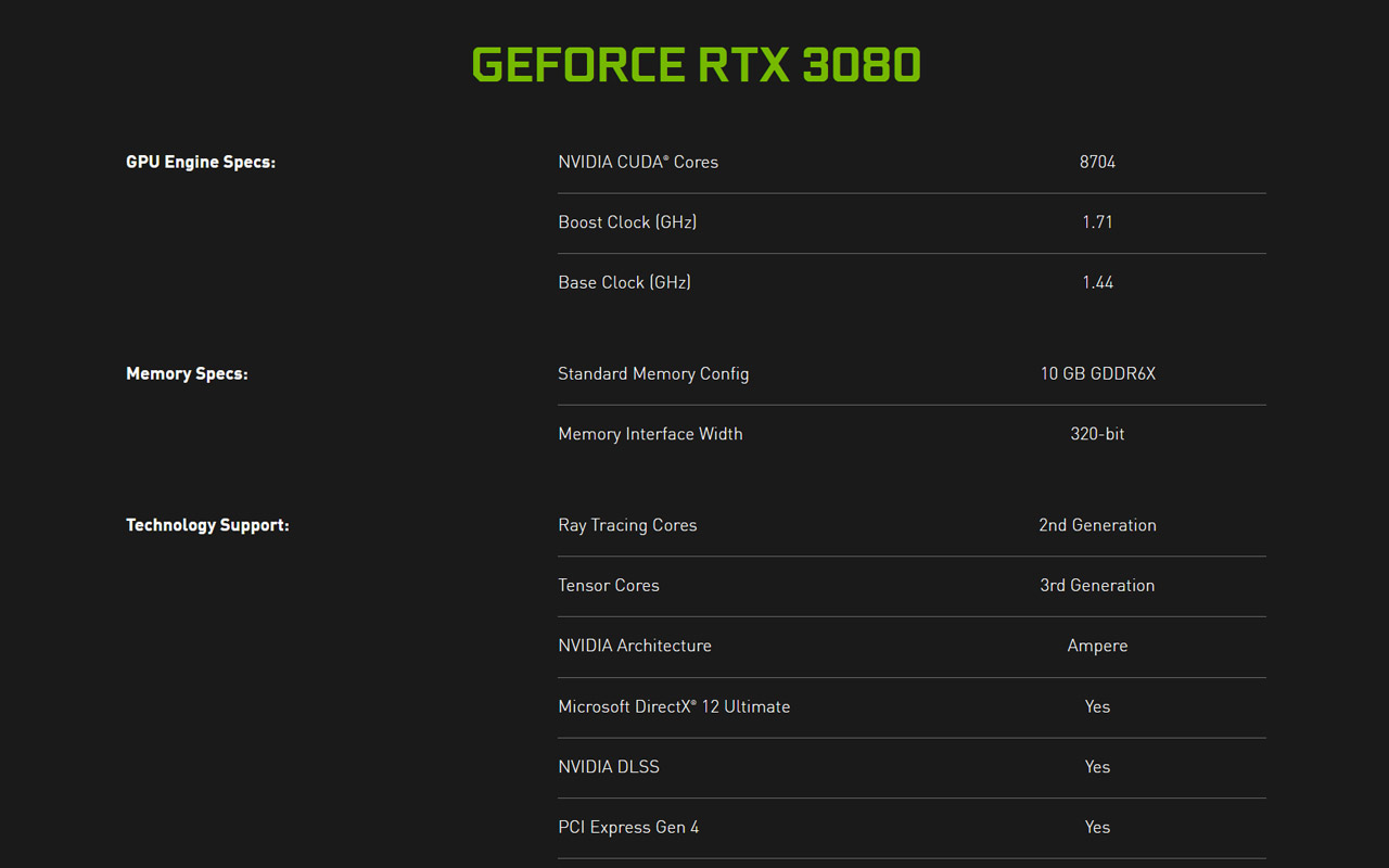The GeForce RTX 3080, the "flagship" of the group, is quoted by NVIDIA as "2x faster than the original RTX 2080". This card works with NVIDIA's new custom 8N manufacturing process with GDDR6X memory and 28 billion transistors.