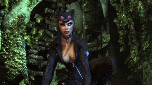 In the next scene there's smoke, in the scene after that there's another heavy amount of paper bills floating around, and all throughout your brain will be melting with the pleasure that comes from seeing TOO MUCH awesome stuff going on in a single gaming screen. Then there's one more bit you'll need to know for now, and it's about tessellation. With PhysX effects you'll now be able to enable enhancements including DirectX 11 tessellation. You can see the result of this new property in the image below, it showing Catwoman at rest in front of one of Batman: Arkham City's tessellated environments